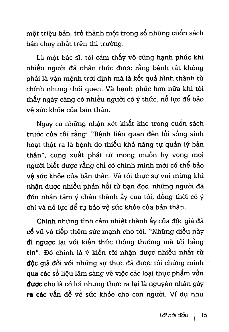 Ngày nay, nền y học hiện đại đang không ngừng phát triển, thế nhưng tại sao số người phải chống chọi với bệnh tật vẫn không hề giảm bớt? | | Sau hàng chục năm nghiên cứu, bác sĩ Hiromi Shinya nhận ra rằng việc một người hấp thu loại thực phẩm gì, với số lượng bao nhiêu, cũng như có thói quen sinh hoạt như thế nào đều quan hệ mật thiết tới vị tướng, tràng tướng. Hơn nữa, việc này còn liên quan tới cả tình trạng sức khỏe của chính người đó. | | Tại các cơ sở y tế, các bác sĩ cũng hướng dẫn ăn uống đối với một số căn bệnh cần phải hạn chế ăn uống như bệnh tiểu đường. Tuy nhiên, những hướng dẫn đó chỉ giúp bệnh tình không trở nặng hơn. Không quá lời khi nói rằng cho đến nay, những hướng dẫn trong cách ăn uống, sinh hoạt để bệnh nhân không bị bệnh, hay có thể sống thọ một cách khỏe mạnh vẫn còn là điểm mù của nền y học hiện đại. | | Vốn dĩ cơ thể con người có rất nhiều hệ thống phòng vệ và cơ chế miễn dịch bảo vệ khỏi bệnh tật. Do đó, nếu không phải là các vấn đề bẩm sinh, chỉ cần không làm những việc quá bất thường thì dù đôi khi vi phạm một hai điều, bạn vẫn sẽ không bị mắc bệnh. | | Nguyên nhân lớn nhất khiến cơ thể vốn có cơ chế tự bảo vệ bị mắc bệnh chính là do “thói quen ăn uống và sinh hoạt sai lầm” được tích lũy trong thời gian dài. | | Do phần lớn mọi người không biết thực phẩm nào là tốt, thực phẩm nào là không tốt đối với cơ thể con người nên mới bị mắc bệnh. Với tâm nguyện giới thiệu về thói quen ăn uống và sinh hoạt đúng đắn để giúp mọi người có thể duy trì sức khỏe của bản thân, tác giả đã cho ra đời cuốn sách Nhân tố enzyme – Phương thức sống lành mạnh giới thiệu với mọi người về “bữa ăn lý tưởng” và thói quen sinh hoạt lý tưởng”. Đã nhận được rất nhiều phản hồi từ bạn đọc trên thế giới. | | Nhưng nếu như Nhân tố enzyme – Phương thức sống lành mạnh chỉ là những đề xuất “lý tưởng”, thì cuốn sách này của tác giả chính là “cuốn thực hành” để bạn có thể vừa tận hưởng cuộc sống, vừa biết cách ăn uống, sinh hoạt tốt cho cơ thể của mình. Trong cuốn sách này, tác giả đã trình bày nhiều phương pháp để bạn có thể biết được giới hạn cho phép của bản thân và có thể thực hiện những thói quen sinh hoạt tốt cho cơ thể mà không quá hà khắc. | | Hy vọng rằng bạn có thể tìm thấy phương pháp phù hợp với lối sống riêng của mình để có thể vừa tận hưởng cuộc sống, vừa có thể sống khỏe mạnh mỗi ngày. | | Mục lục: | | Lời nói đầu: Cơ thể con người có thể sống mà không mắc bệnh | | CHƯƠNG 1 PHƯƠNG PHÁP SỐNG ĐẠT ĐẾN TUỔI THỌ TỰ NHIÊN | | Câu nói cửa miệng của mẹ tôi là: “Hãy trở thành một bác sĩ như Hideyo Noguchi!” | | Đừng sống “bùng nổ để rồi vụt tắt”, hãy sống “bùng nổ nhưng vẫn dài lâu” | | Đừng để giá trị tuổi thọ trung bình đánh lừa | | Lý do người dân Okinawa sống lâu dù rất hay ăn thịt lợn | | Tại sao vẫn có những người có thói quen hút thuốc mà lại sống được đến 90 tuổi? | | “Cả nhà tôi đều bị ung thư”, chuyện này không phải là số mệnh | | Bạn nên cẩn thận với các phương pháp chống lão hóa | | Phương pháp chống lão hóa tốt nhất chính là sống lành mạnh | | Bí quyết trường thọ và khỏe mạnh mà enzyme chỉ cho chúng ta | | CHƯƠNG 2 GIẢI MÃ ENZYME | | Táo bón cũng là nguyên nhân dẫn đến ung thư | | Coi nhẹ những thay đổi nhỏ sẽ dẫn đến những biến đổi lớn | | Hai mươi điềm báo − tín hiệu nguy hiểm thông báo sự thiếu hụt enzyme | | Hấp thu “gen di truyền tốt” | | Đường ruột chính là “bộ não thứ hai” biết tự suy nghĩ | | “Lịch sử của sự sống” được lưu lại trong gen di truyền | | Gen − enzyme − vi sinh vật, mối quan hệ ba bên | | Năm quá trình lưu thông và bảy phương pháp sống khỏe | | CHƯƠNG 3 THÓI QUEN ĂN UỐNG LÀNH MẠNH | | Tại sao người Ấn Độ lại có thể uống nước sông Hằng? | | Tinh hoa trí tuệ được cất giấu trong các món ăn truyền thống giúp con người sống khỏe mạnh | | Quyết định ăn gì dựa trên quan điểm enzyme | | Dù là rau hay thịt, tất cả các loại thức ăn đều là sinh mệnh | | Các thực phẩm có nguồn gốc từ nhà máy không có sinh mệnh | | Cách ăn đúng đắn nằm trong ngũ cốc | | Lựa chọn hạt ngũ cốc chưa tinh chế hay ngũ cốc nguyên hạt | | Nấu cơm gạo lứt dễ hơn bạn tưởng | | Gạo lứt nảy mầm cũng có thể tự làm ở nhà | | Lý do ăn sống thực phẩm tươi mới là tốt | | Hoa quả là món quà sinh mệnh do thiên nhiên ban tặng | | Bạn có biết quá trình chế tạo nước ép hoa quả cô đặc không? | | Lý do tôi khuyến khích ăn toàn bộ | | Hãy nhớ những loại rau bạn thấy đẹp mắt cũng là “thực phẩm có nguồn gốc từ nhà máy” | | Thành phần quan trọng bị thiếu trong các loại “rau trồng trong nhà kính” | | Tại sao muối ăn lại không tốt ch