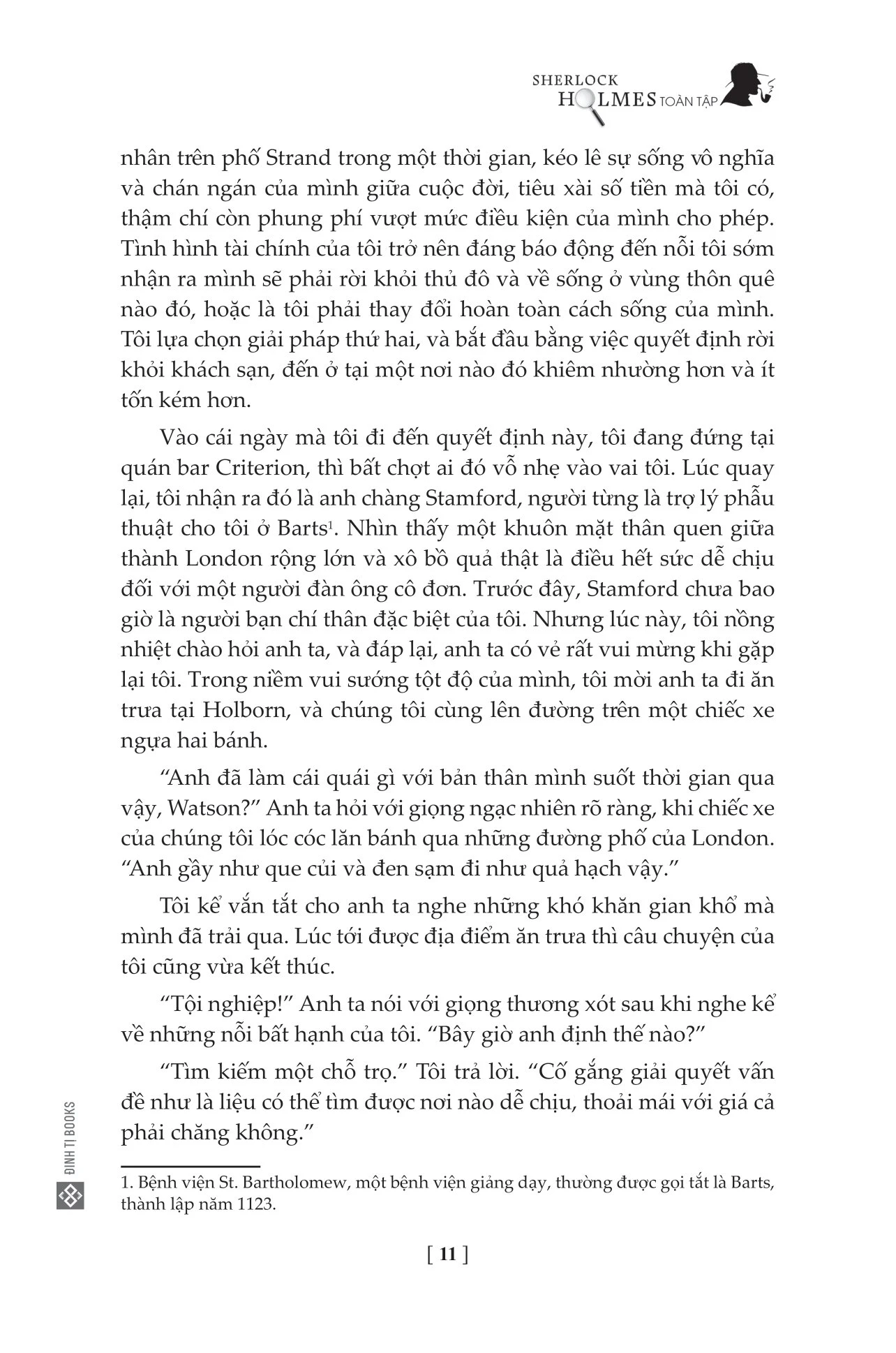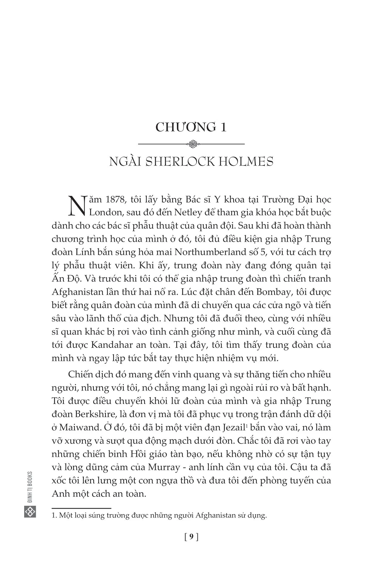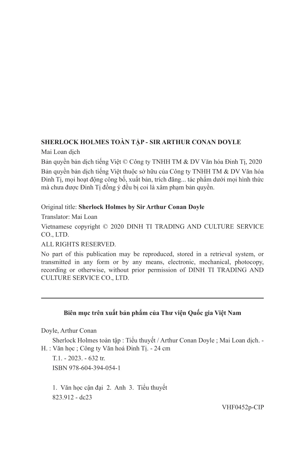 Sherlock Holmes Toàn Tập - Tập 1 | | "Tên tôi là Sherlock Holmes. Việc của tôi là biết những điều mà người khác không biết.” | | Từ căn hộ 221B phố Baker, London, Sherlock Holmes đã cùng với người bạn thân, người bác sĩ, cũng là người viết tiểu sử John H. Watson, bắt tay giải quyết những vụ án lạ lùng, bí ẩn và đôi lúc tưởng chừng đi vào ngõ cụt. | | Sherlock Holmes toàn tập, gồm 3 cuốn sách với 4 thiên tiểu thuyết và 56 truyện ngắn của nhà văn Sir Arthur Conan Doyle hy vọng sẽ giúp quý độc giả hiểu rằng không phải ngẫu nhiên Sherlock Holmes được biết đến là nhân vật thám tử hư cấu nổi tiếng nhất trong lịch sử văn học, và tác phẩm này không chỉ là tiểu thuyết trinh thám đơn thuần, mà còn là một danh tác kinh điển. Với sự pha trộn của trí tuệ sắc bén, sự phân tích tinh tế và khả năng suy luận đỉnh cao, Sherlock Holmes đã trở thành biểu tượng vĩ đại trong thế giới văn học và vẫn tiếp tục thu hút người đọc trên khắp thế giới suốt hàng thế kỷ. | | Đặc biệt, cùng với tranh minh họa, nhân vật thám tử tài ba Sherlock Holmes được tái hiện một cách chân thực, sống động và đầy đủ hơn trong cuộc sống đời thường cũng như trong các vụ án gay cấn, hấp dẫn qua những trang sách. Bất kỳ người đọc nào yêu thích những câu chuyện kịch tính, những mưu đồ rối ren, những bí mật ẩn sau những hiện tượng siêu nhiên đều sẽ tìm thấy trong bộ sách này một kho báu vô cùng quý giá. | | Không chỉ đơn thuần là những câu chuyện trinh thám, Sherlock Holmes toàn tập còn tạo nên một hình ảnh sâu sắc về xã hội và cuộc sống thời Victoria. Với các nhân vật đa dạng và tạo hình rõ ràng về London thế kỷ 19, tác giả Sir Arthur Conan Doyle miêu tả lại tầng lớp xã hội đầy sắc màu qua mắt của Sherlock Holmes. | | Kiệt tác “Sherlock Holmes toàn tập” của nhà văn Sir Arthur Conan Doyle đã được Đinh Tị Books giới thiệu tới bạn đọc trong một DIỆN MẠO MỚI và BẢN DỊCH ĐẦY ĐỦ của dịch giả Mai Loan (người đã có kinh nghiệm chuyển ngữ thành công rất nhiều tác phẩm cả kinh điển, trong số đó có thể kể đến “David Copperfield” của đại văn hào Charles Dickens). | | Xem thêm