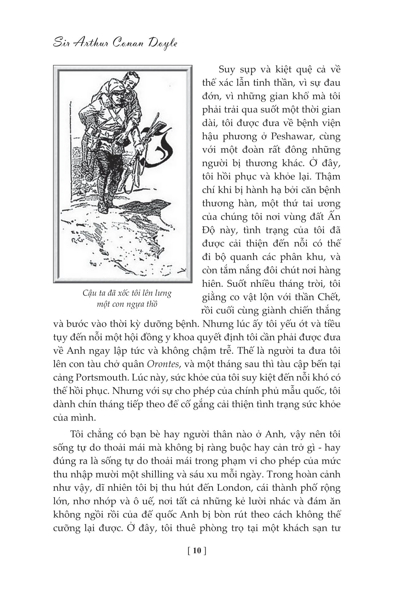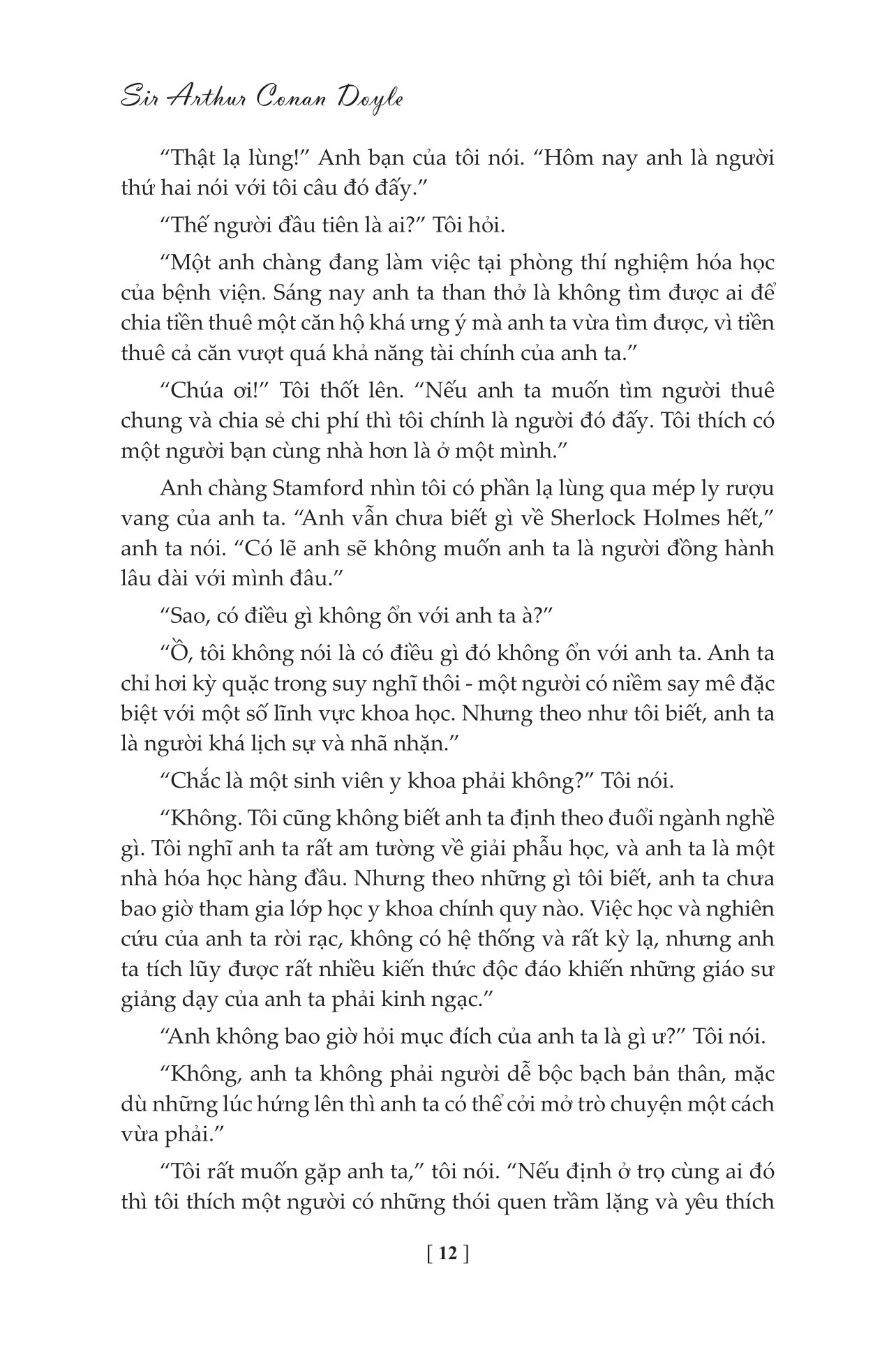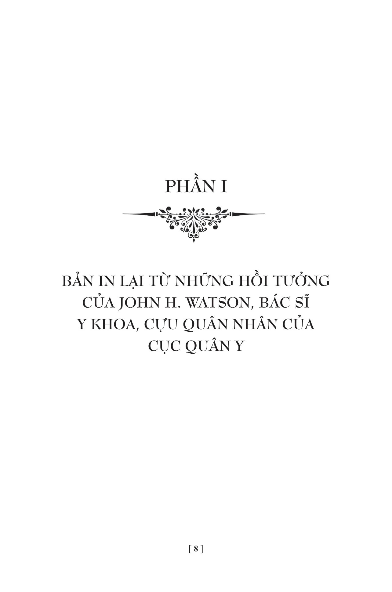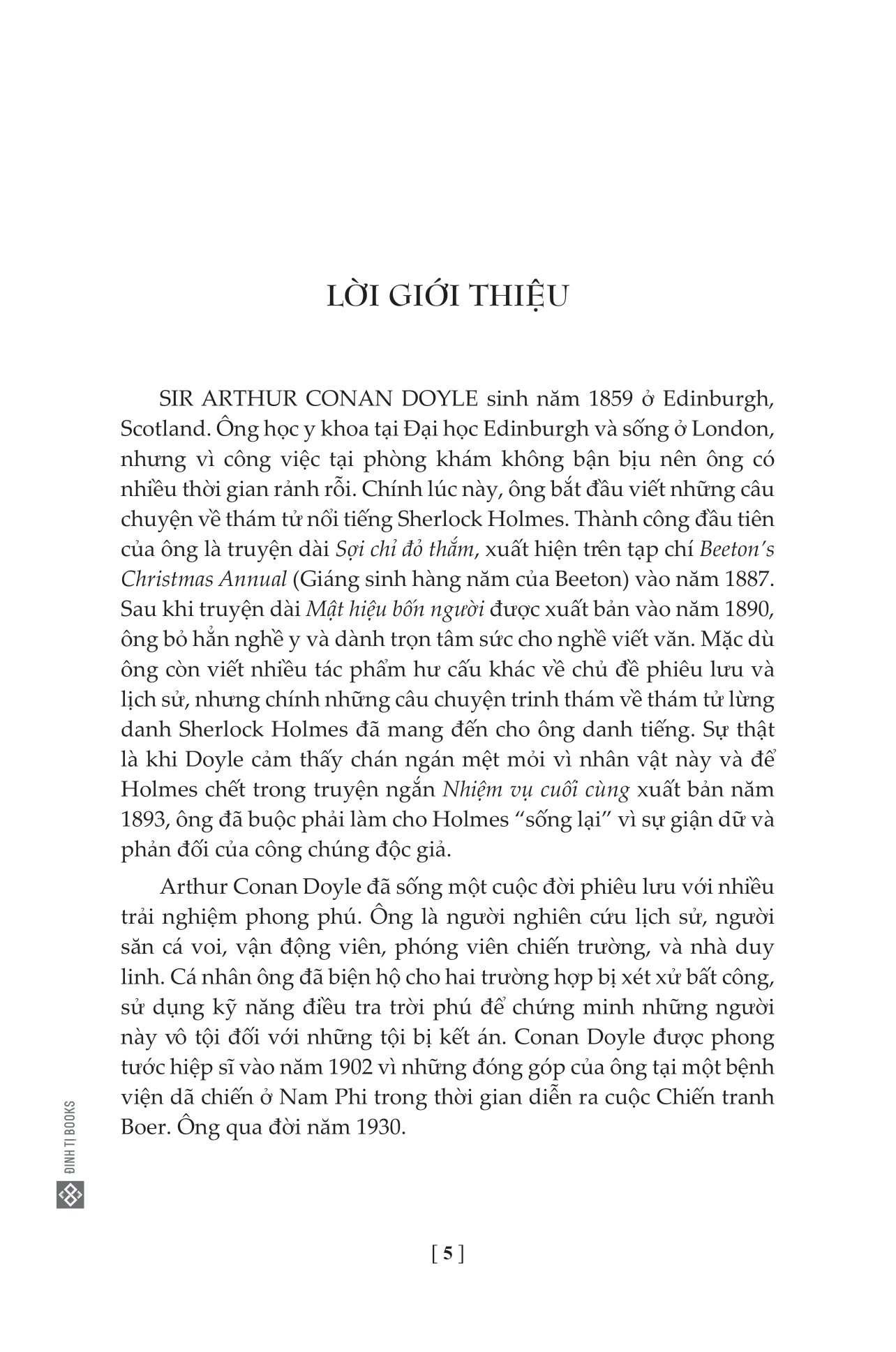 Sherlock Holmes Toàn Tập - Tập 1 | | "Tên tôi là Sherlock Holmes. Việc của tôi là biết những điều mà người khác không biết.” | | Từ căn hộ 221B phố Baker, London, Sherlock Holmes đã cùng với người bạn thân, người bác sĩ, cũng là người viết tiểu sử John H. Watson, bắt tay giải quyết những vụ án lạ lùng, bí ẩn và đôi lúc tưởng chừng đi vào ngõ cụt. | | Sherlock Holmes toàn tập, gồm 3 cuốn sách với 4 thiên tiểu thuyết và 56 truyện ngắn của nhà văn Sir Arthur Conan Doyle hy vọng sẽ giúp quý độc giả hiểu rằng không phải ngẫu nhiên Sherlock Holmes được biết đến là nhân vật thám tử hư cấu nổi tiếng nhất trong lịch sử văn học, và tác phẩm này không chỉ là tiểu thuyết trinh thám đơn thuần, mà còn là một danh tác kinh điển. Với sự pha trộn của trí tuệ sắc bén, sự phân tích tinh tế và khả năng suy luận đỉnh cao, Sherlock Holmes đã trở thành biểu tượng vĩ đại trong thế giới văn học và vẫn tiếp tục thu hút người đọc trên khắp thế giới suốt hàng thế kỷ. | | Đặc biệt, cùng với tranh minh họa, nhân vật thám tử tài ba Sherlock Holmes được tái hiện một cách chân thực, sống động và đầy đủ hơn trong cuộc sống đời thường cũng như trong các vụ án gay cấn, hấp dẫn qua những trang sách. Bất kỳ người đọc nào yêu thích những câu chuyện kịch tính, những mưu đồ rối ren, những bí mật ẩn sau những hiện tượng siêu nhiên đều sẽ tìm thấy trong bộ sách này một kho báu vô cùng quý giá. | | Không chỉ đơn thuần là những câu chuyện trinh thám, Sherlock Holmes toàn tập còn tạo nên một hình ảnh sâu sắc về xã hội và cuộc sống thời Victoria. Với các nhân vật đa dạng và tạo hình rõ ràng về London thế kỷ 19, tác giả Sir Arthur Conan Doyle miêu tả lại tầng lớp xã hội đầy sắc màu qua mắt của Sherlock Holmes. | | Kiệt tác “Sherlock Holmes toàn tập” của nhà văn Sir Arthur Conan Doyle đã được Đinh Tị Books giới thiệu tới bạn đọc trong một DIỆN MẠO MỚI và BẢN DỊCH ĐẦY ĐỦ của dịch giả Mai Loan (người đã có kinh nghiệm chuyển ngữ thành công rất nhiều tác phẩm cả kinh điển, trong số đó có thể kể đến “David Copperfield” của đại văn hào Charles Dickens). | | Xem thêm
