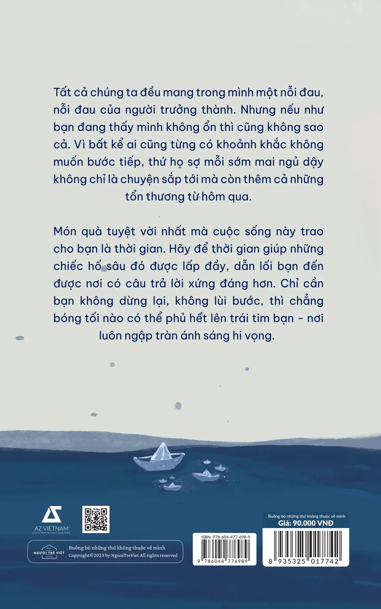 Buông Bỏ Những Thứ Không Thuộc Về Mình | | Có những nỗi đau lăn tăn trong lòng bạn, ẩn chứa nhiều mất mát vỡ vụn, một ngày nào đó bạn bất chợt nhìn lại sẽ thấy nó vốn không đáng để đau nhiều như đã từng. | | Có tình huống cũ, mối tình xưa mà bạn từng dùng hết tâm sức theo đuổi. Sau này, trong một thời điểm nó trở thành đôi ba chuyện nói cho vui, thì ra không quá quan trọng. | | Có những vấp ngã, khó khăn tưởng chừng không thể nào chạm chân bước qua. Đến hiện tại, ta nhận ra mình từng lo xa quá nhiều. | | Thấy chưa, chỉ cần biết buông bỏ, bạn rồi sẽ lại bình yên thôi. Vì “Có những hạnh phúc rực rỡ như pháo hoa, đẹp như hoa đào thì qua mùa xuân, nó cũng phải đến lúc rời đi”. | | Đó cũng là lời nhắn gửi mà Ngạn Hy gửi đến bạn trong cuốn sách “Buông bỏ những thứ không thuộc về mình”. Trên hành trình chữa lành vết thương lòng, mong bạn nhớ rằng bạn xứng đáng được hạnh phúc hơn những gì bạn nghĩ. Vì những người yêu thương bạn, bằng một cách âm thầm đều cầu mong bạn bình an mỗi ngày. Nụ cười của bạn, là điều mà vài người muốn giữ lấy. Trái tim của bạn, đều có người muốn nắm bắt. | | Gấp lại cuốn sách này, chúc cho bạn những điều bình dị và ngọt ngào nhất. “Mong bạn có thể đi dưới những bóng mát vào ngày hạ, mang ô vào ngày mưa và mặc đủ ấm vào ngày lạnh. Mong bạn có thể tìm cho mình một nơi trú chân, một người xoa dịu tổn thương, một đam mê để theo đuổi”. | | Cuối cùng, cảm ơn sự có mặt của bạn trong cuộc đời này, yêu bạn thật nhiều! | | Xem thêm