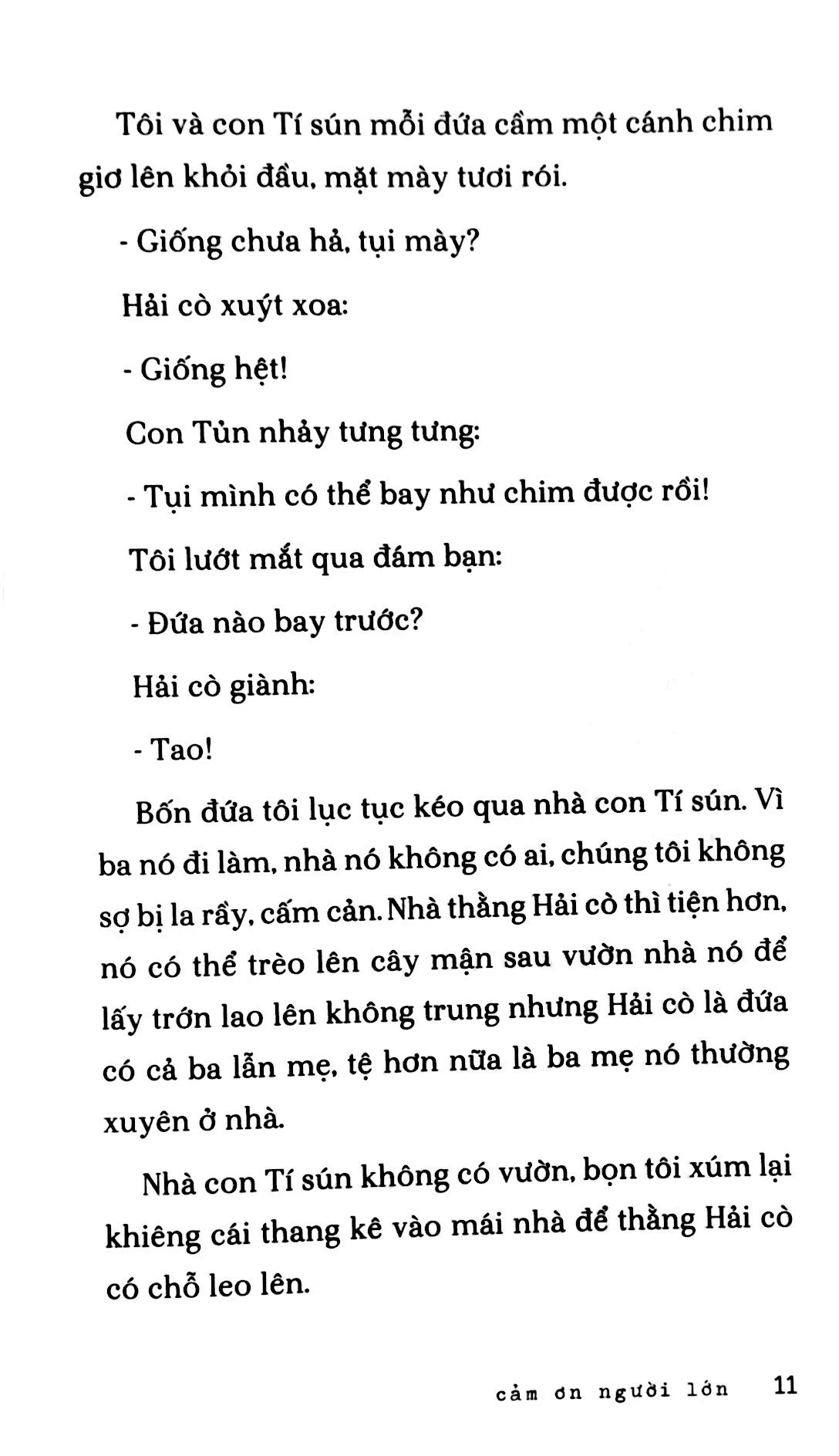Cảm Ơn Người Lớn (Bìa Mềm) | | Cảm ơn người lớn - một áng văn lãng mạn trong giọng hài hước đặc biệt “dành cho trẻ em, và những ai từng là trẻ em”.. | | Bạn sẽ gặp lại Mùi, Tủn, Tí sún, Hải cò… của Cho tôi xin một vé đi tuổi thơ, cùng chơi những trò chơi quen thuộc, và được đắm mình vào những ước mơ điên rồ, ngốc nghếch nhưng trong veo của tuổi mới lớn hồn nhiên và đầy ắp dự định. | | Và cả khi họ đã trưởng thành, bạo chúa thời gian đã vùng vẫy thế nào trong cuộc đời của những nhân vật mà bạn yêu quý…Hãy bắt đầu đọc từ bất cứ trang nào, có thể đọc bất cứ lúc nào, và cùng với bất cứ ai. Bạn sẽ nhận được món quà “n trong 1” của nhà văn Nguyễn Nhật Ánh: sẽ n lần thổn thức qua 1 cuốn sách 19 chương đầy ắp tình bạn ngây thơ, tình xóm giềng tốt lành nhân ái, tình yêu đắm đuối ngọt ngào… | Cảm ơn người lớn được Nguyễn Nhật Ánh đặt bút viết đúng sau 10 năm ra đời Cho tôi xin một vé đi tuổi thơ – cuốn sách bán chạy tới nay đã 400.000 bản. | | TRÍCH ĐOẠN HAY TRONG SÁCH | | “Tôi viết cuốn sách này không dành cho trẻ em. Tôi viết cho những ai từng là trẻ em.” (CHO TÔI XIN MỘT VÉ ĐI TUỔI THỚ) | | ---o0o--- | | So với trẻ con, người lớn luôn cảm thấy thiếu thốn và luôn cảm thấy đau khổ. “Ôi, đời tôi sao khổ thế này!” - đó là câu người lớn hay than, từ người không đủ tiền mua một tấm áo đến người thiếu một khoản tiền nhỏ để có thể mua một ngôi nhà lớn. | Trẻ con không bao giờ than như thế, vì bọn tôi cả đời chỉ cần đủ tiền mua bánh kẹo, cà rem, xi-rô, ổi xoài (tất nhiên cuộc đời trẻ con chỉ kéo dài đến chừng nào trở thành người lớn). Đang đói bụng mà có tiền mua một ổ bánh mì là cuộc sống bọn tôi lập tức biến thành màu hồng dù trước đó nó được vẽ bằng gam màu nhem nhuốc gì đi nữa. | | Tóm lại, trẻ con chẳng có mơ ước gì cao xa. Nhờ vậy bọn trẻ không có nhiều khổ não, thất vọng hay bất đắc chí như người lớn. Người lớn cũng biết thế nên họ tự đặt ra các câu danh ngôn để tự răn mình. Lớn lên tôi đọc được câu “tri túc tiện túc đãi túc hà thời túc” – “biết đủ thì ắt thấy đủ, còn đợi cho đủ sẽ chẳng bao giờ thấy đủ”. Câu nói rất hay (người lớn bao giờ cũng nói hay) nhưng sau khi gật gù khen hay, người lớn thường làm ngược lại. | | (CẢM ỚN NGƯỜI LỚN) | | Xem thêm