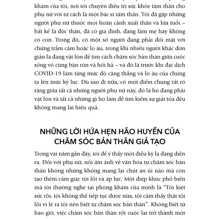 Lakshmin mở đầu quyển sách bằng cách bóc trần các phương pháp chăm sóc bản thân giả tạo trước giờ vẫn luôn khai thác tinh vi sự bất an của phụ nữ và những nhóm yếu thế. Cô chỉ ra làm thế nào mà các phương pháp vốn là sản phẩm của nền văn hóa tiêu thụ có thể khiến nhiều người tin rằng họ sẽ giải quyết được mọi vấn đề, trong khi thực tế là chúng chỉ khiến họ thêm áp lực, thậm chí là ngày càng mệt mỏi và kiệt sức.