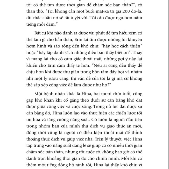Tác giả cũng cung cấp một lộ trình rõ ràng để mỗi người tự xây dựng phương pháp chăm sóc bản thân phù hợp với mình. Thông qua các bài tập, câu hỏi và công cụ thực tế, Lakshmin khuyến khích bạn đọc nhận diện giá trị cá nhân, thiết lập ranh giới và củng cố quyền tự chủ để từ đó dũng cảm đưa ra những quyết định khó khăn, tuy có thể trái với kỳ vọng của gia đình hoặc chuẩn mực xã hội nhưng lại cần thiết để sống một cuộc đời trọn vẹn và mỹ mãn.