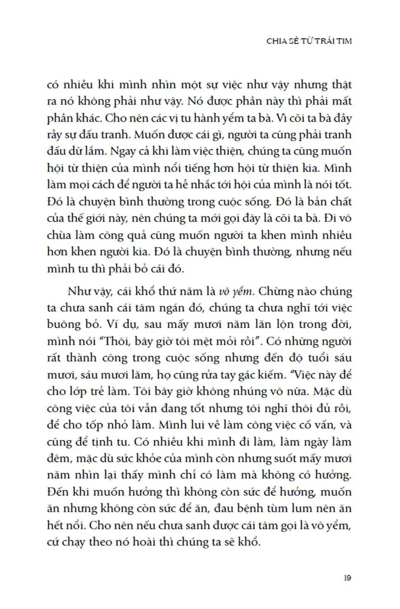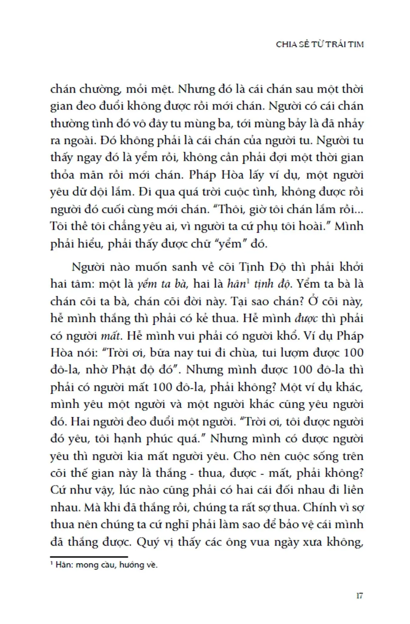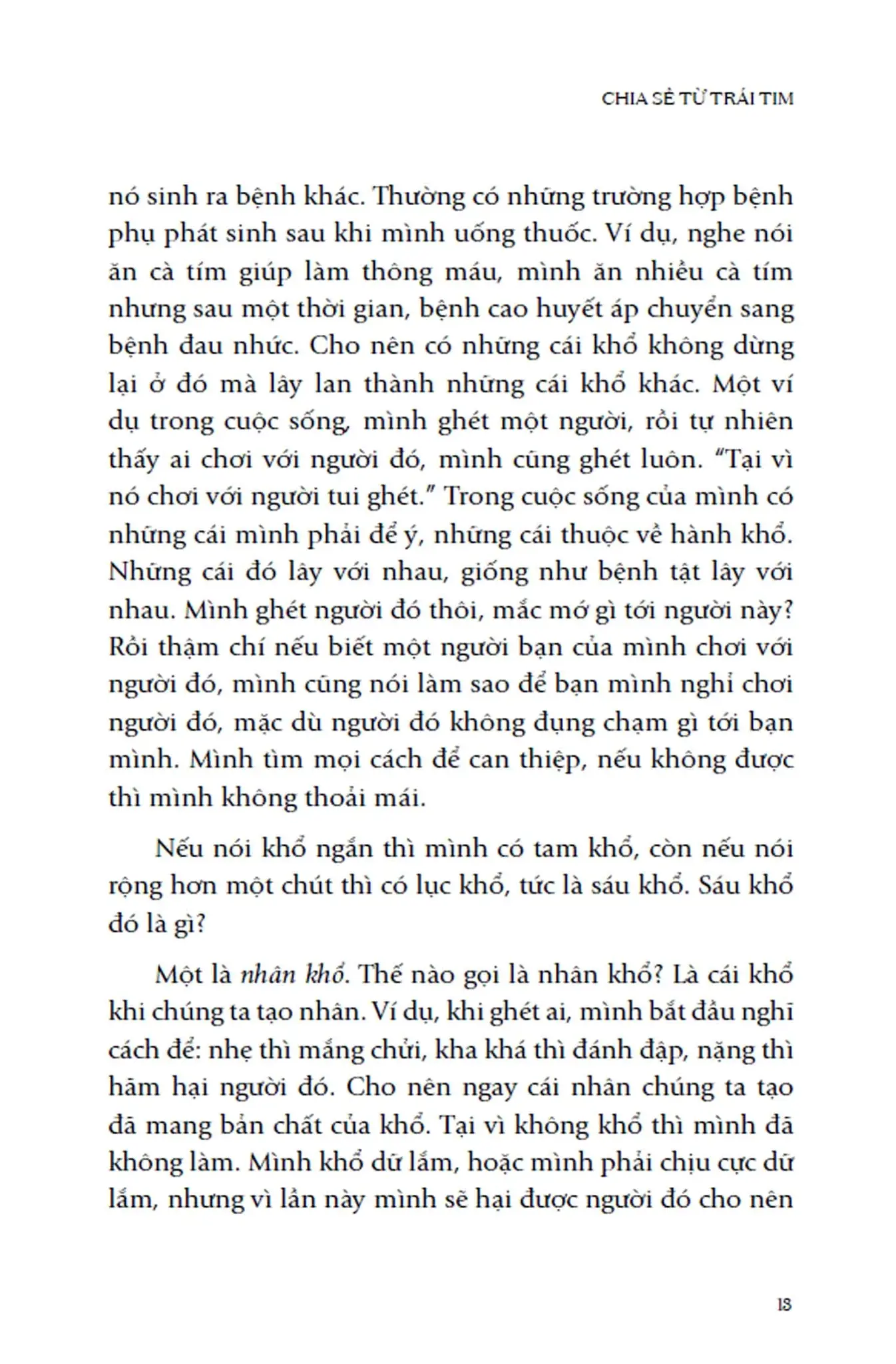 Chia sẻ từ trái tim là một tuyển tập từ hàng trăm bài pháp thoại của Sa Môn Thích Pháp Hòa, được sắp xếp theo các chủ đề nhằm hệ thống lại những khái niệm, tư tưởng căn bản của đạo Phật qua lời giảng gần gũi của thầy, để mỗi người chúng ta có thể đưa vào áp dụng trong chính cuộc sống hằng ngày của mình.