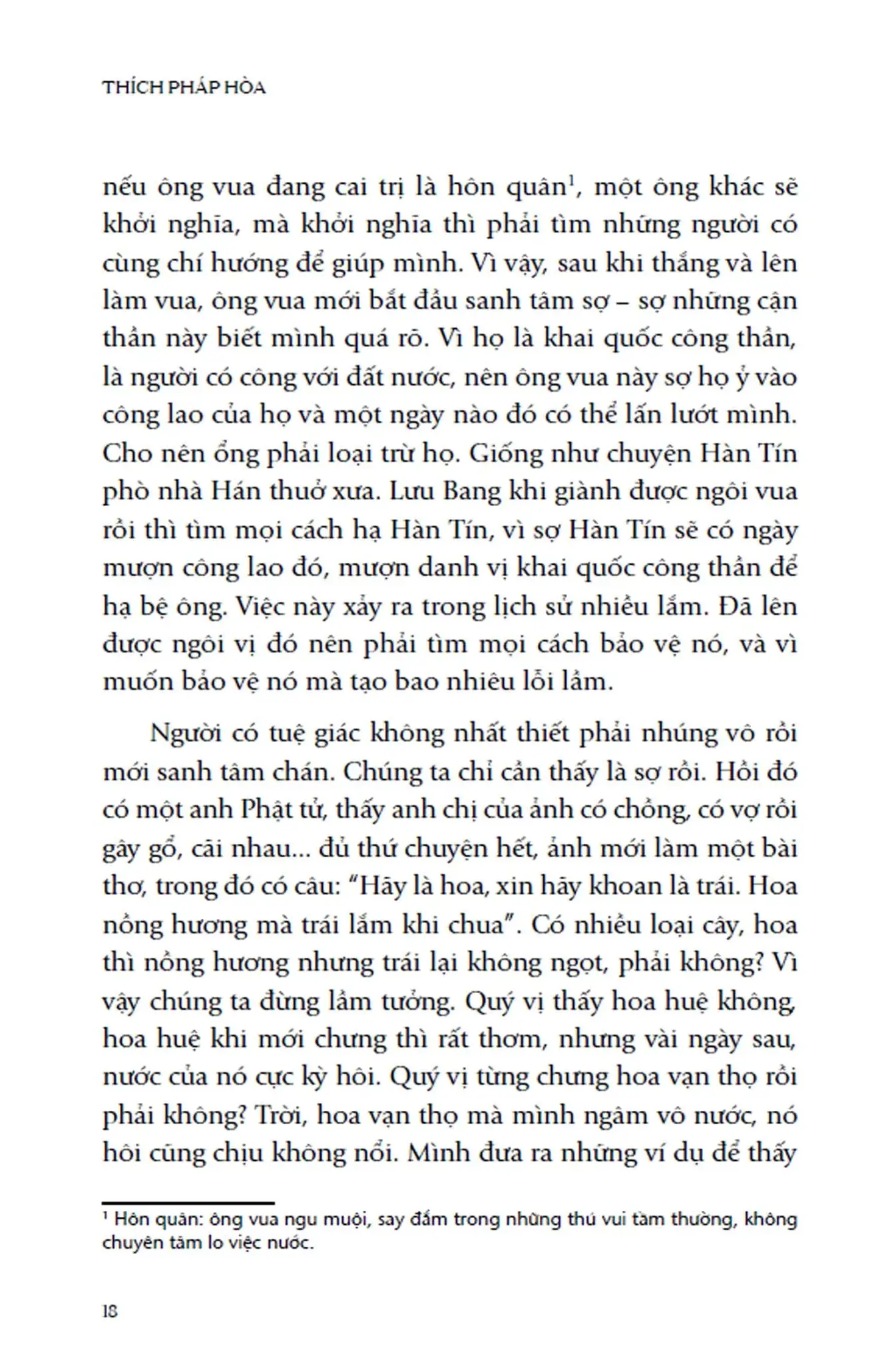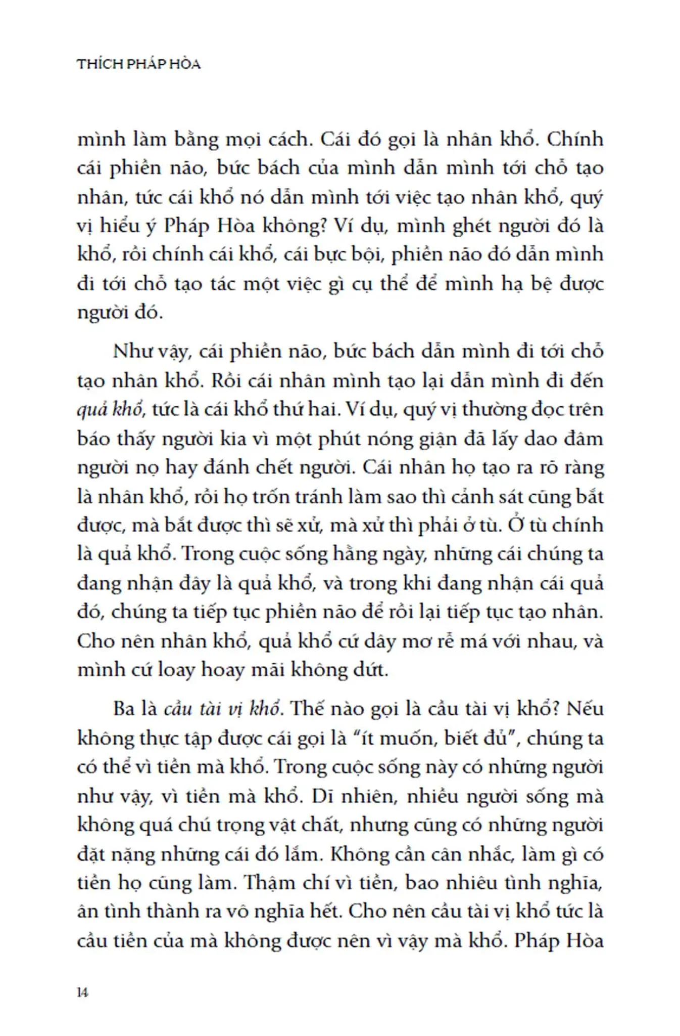 Trong quyển sách này, quý vị sẽ được tiếp cận Nhân Quả theo một cách giản dị qua những câu chuyện đời thường của thầy Thích Pháp Hòa. Trong khi ngôn ngữ của giáo lý thường là rào cản thì những câu chuyện vui, những ví dụ gần gũi lại có khả năng mang chúng ta đến gần hơn với sự thật của đời sống. Những lời chia sẻ và câu chuyện của thầy Pháp Hòa về các mối quan hệ và cách ứng xử trong xã hội như cha mẹ - con cái, vợ - chồng, thầy - trò, bạn bè, v.v… cũng được ban biên tập tuyển chọn và giới thiệu đến quý bạn đọc. Thông qua đó, chúng ta thấy được “Phật pháp tại thế gian, bất ly thế gian giác” – Phật pháp không ở đâu xa ngoài đời sống thế gian.