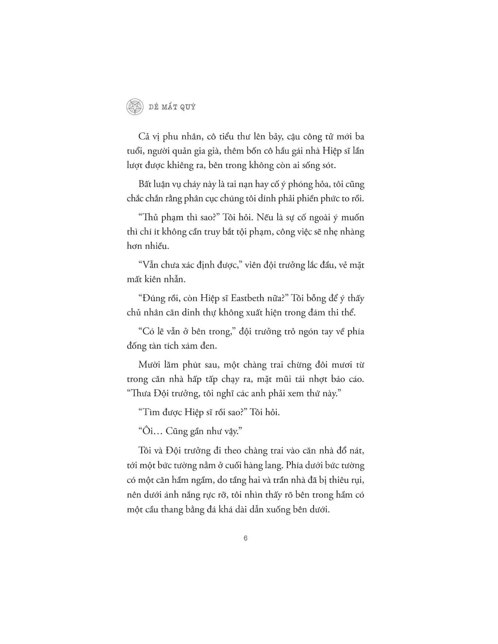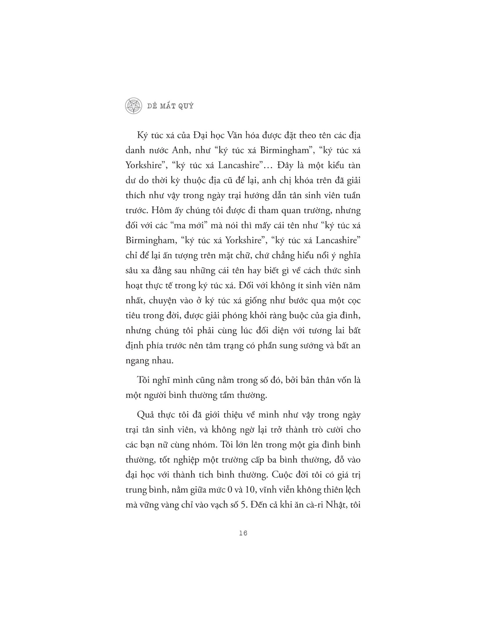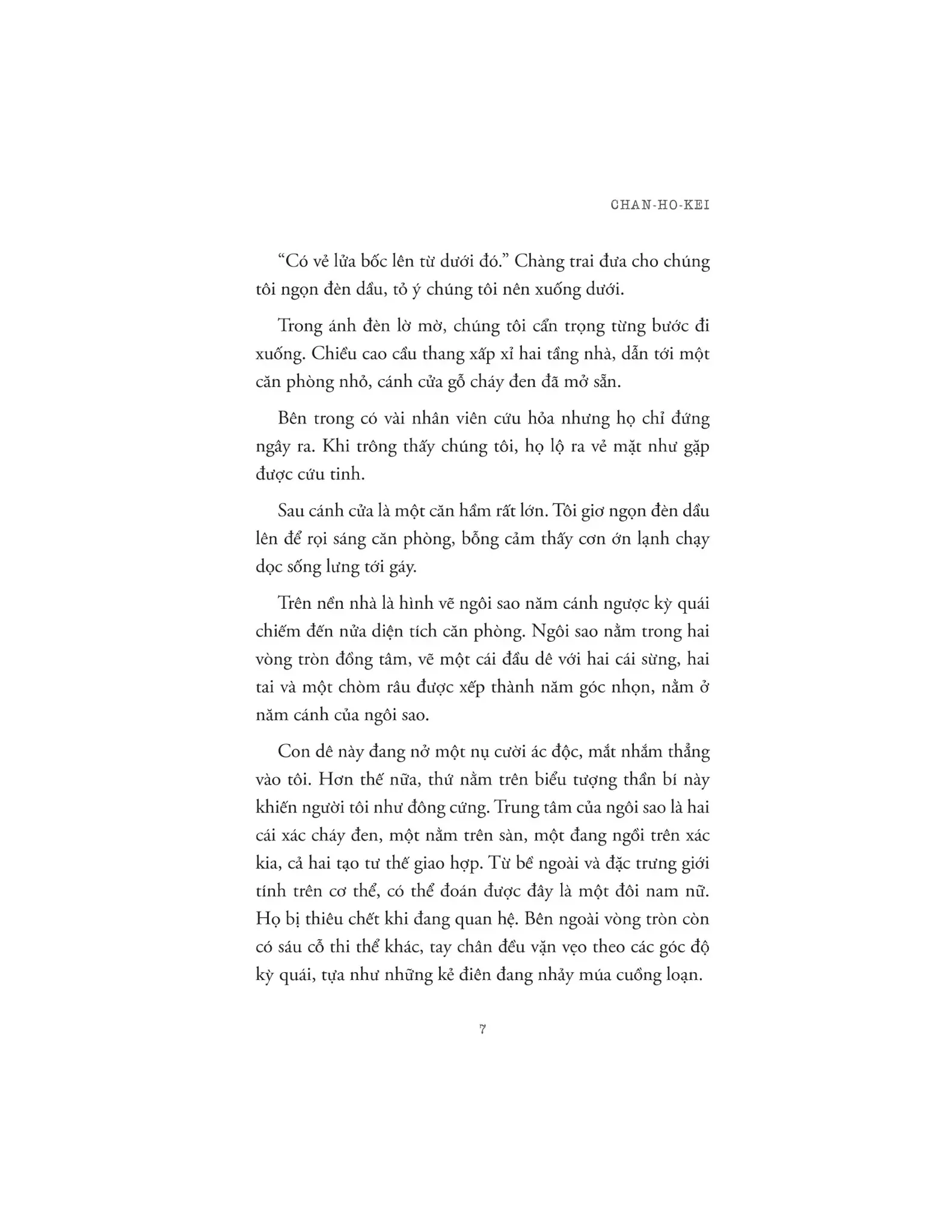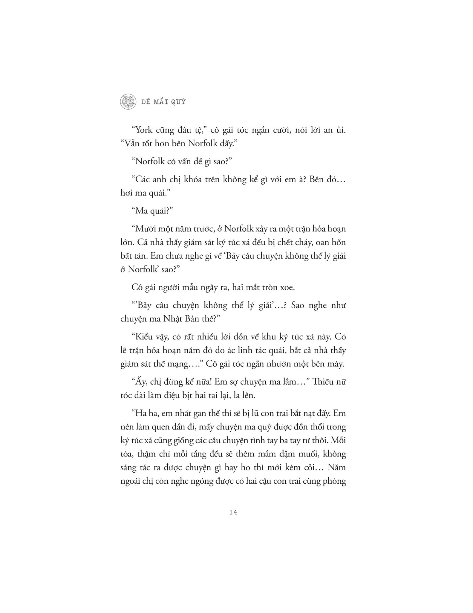 Dê Mắt Quỷ | | Diệp – nhân vật chính của tác phẩm – là một cậu sinh viên mới chân ướt chân ráo buổi đầu đến ký túc xá một trường đại học để nhận phòng tại Norfolk. Nhưng ngay đêm đầu tiên chuyển vào ký túc xá, cậu và nhóm bạn đã bị “nhắm tới”. Có lẽ họ không nên bàn tán về những truyền thuyết kinh hoàng trong ký túc xá vào lúc nửa đêm, không nên khám phá căn hầm, nơi người ta đồn đại có một quý tộc người Anh đã thực hiện các nghi lễ ma quỷ từ trăm năm trước, càng không nên liều lĩnh chơi trò chơi gọi hồn ở nơi ấy. | | Nhưng đã quá muộn để quay lại, một bạn nữ trong nhóm bỗng biến mất sau trò chơi, và người bạn nam giúp đỡ tìm kiếm cũng mất tích không để lại dấu vết. Không ai biết được chuyện gì đã xảy ra. Nỗi sợ hãi không tên bao trùm, Diệp mơ hồ cảm thấy một công tắc cấm kỵ nào đó đã được bật lên, cậu chỉ muốn cứu những người bạn đang trong lằn ranh sinh tử và ngăn chặn “Bảy câu chuyện ma” của Norfolk xảy ra thêm lần nữa! | | Về tác giả: | | Chan Ho Kei tốt nghiệp khoa Khoa học máy tính trường Đại học Trung văn Hồng Kông và là thành viên Hiệp hội các nhà văn viết truyện trinh thám Đài Loan. | | Anh là tác giả liên tục tạo ra những kỷ lục mới ấn tượng với việc bán bản quyền cho nhiều quốc gia trên thế giới và được đông đảo các độc giả yêu thích và ủng hộ nhiệt liệt. | | Các tác phẩm khác của Chan Ho Kei: “Người trong lưới”, “Người bóng bay”, “Ma trùng nhân gian”... | | Xem thêm
