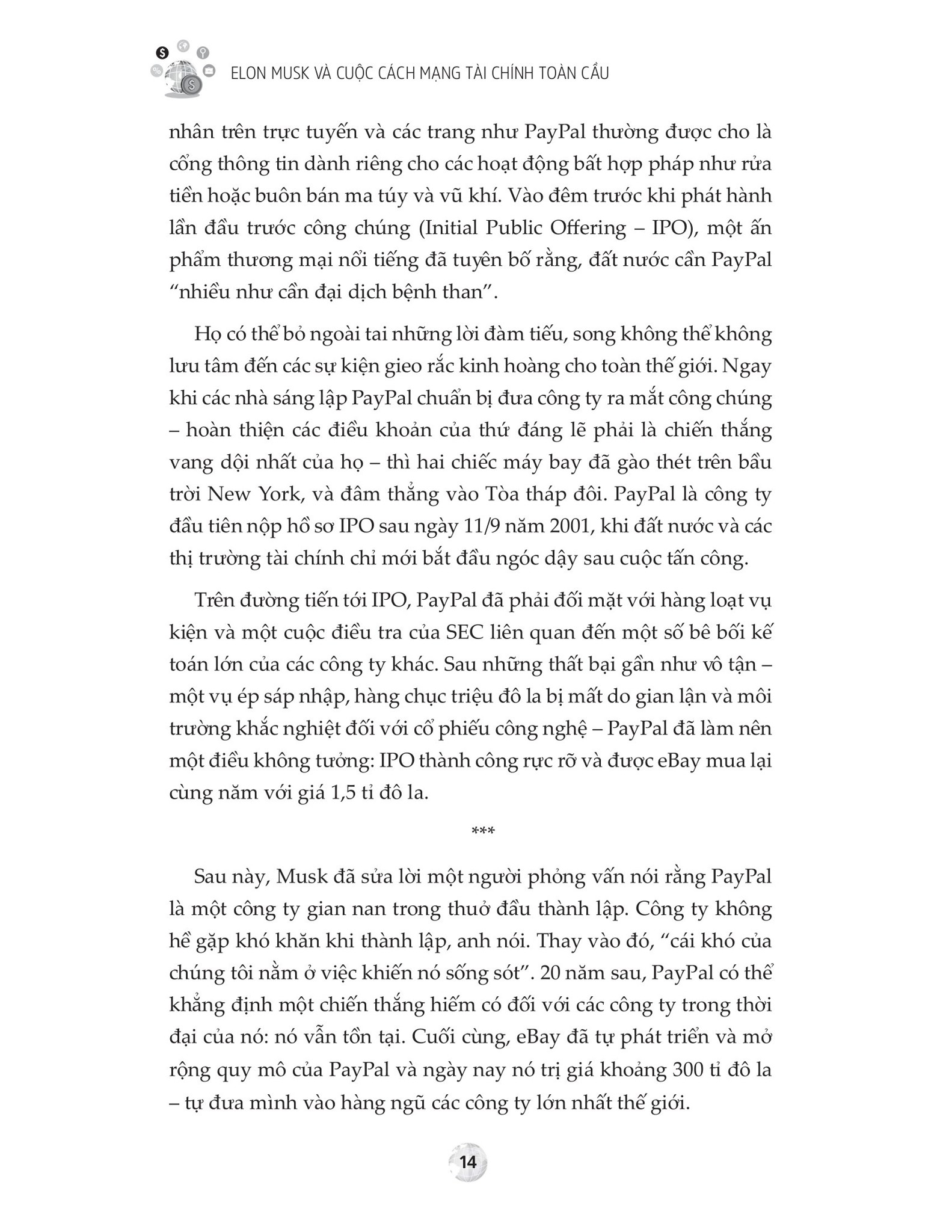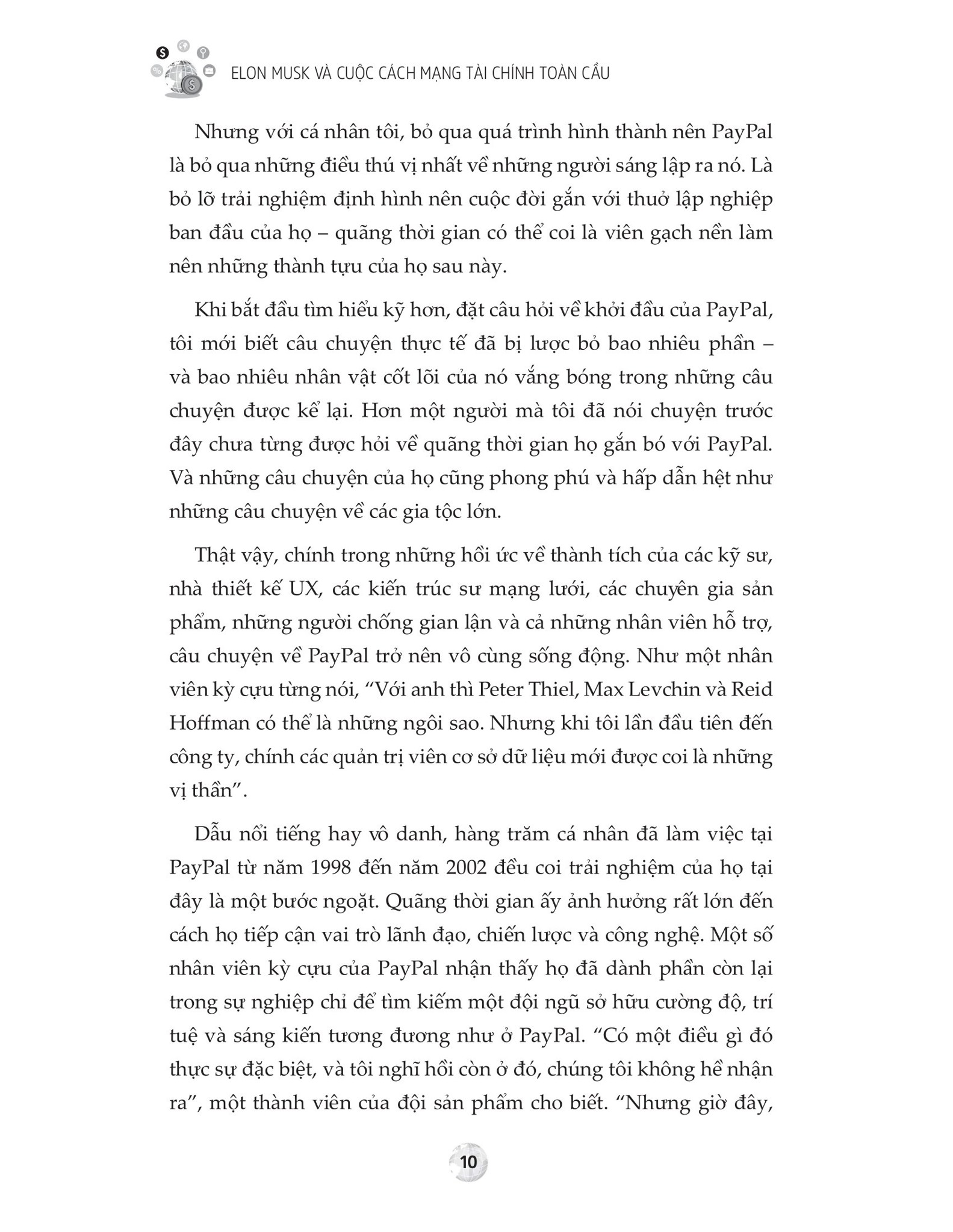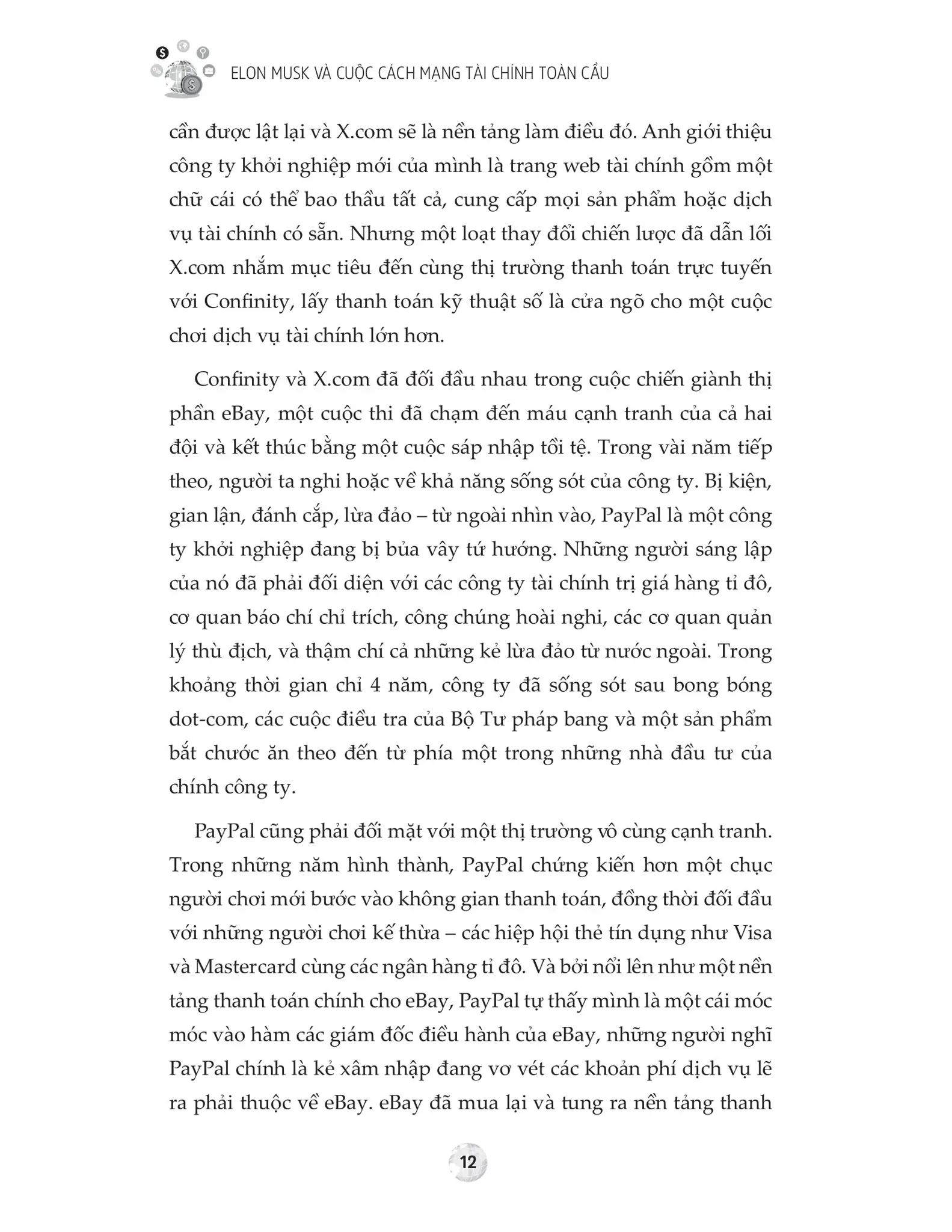 Elon Musk Và Cuộc Cách Mạng Tài Chính Toàn Cầu | | Ngày nay, Elon Musk, Peter Thiel, Max Levchin… được coi là những nhà tiên phong của ngành công nghệ. Tuy nhiên, câu chuyện về nơi họ bắt đầu hầu như không được kể đến. Trước khi thành lập, tài trợ và tư vấn cho các công ty hàng đầu thế giới, bao gồm Tesla, Facebook, YouTube, SpaceX, và LinkedIn, họ là những nhà sáng tạo vô danh của một công ty khởi nghiệp thanh toán trực tuyến nhỏ bé có tên là PayPal. | | Cuốn sách này sẽ khám phá những ngày đầu đầy sóng gió ấy, tìm hiểu câu chuyện về về một nhóm thanh niên tài năng, nhiệt huyết đã tập hợp cùng nhau trong những ngày đầu của internet như thế nào, và thành tựu của họ đã định hình thế giới ngày nay—các công ty khởi nghiệp kỹ thuật số, tài chính không dùng tiền mặt, chuyển tiền điện tử và thay đổi thế giới của chúng ta mãi mãi ra sao. | | Bạn đọc sẽ được chứng kiến hành trình về câu chuyện của công ty PayPal, từ những lần thất bại cho đến sự thành công như ngày nay. Đây là cuốn sách về một ví dụ của thành công, nhưng không tạo gánh nặng cho người đọc bằng những “bài học”. Có một thông điệp quan trọng vượt ngoài cả những bài học về tiền bạc, kinh doanh và cạnh tranh trên thương trường trong cuốn sách. Đó là: Cuộc sống của chúng ta sẽ được định hình bởi những thứ ta tạo ra và những người đồng hành sáng tạo cùng ta. Câu chuyện của PayPal không chỉ là về việc mọi người kết hợp với nhau để tạo nên một sản phẩm – mà còn về cách nhóm cùng nhau định hình chính con người của họ. Những người sáng lập và nhân viên đầu tiên của công ty đã thúc đẩy và yêu cầu nhau phát triển hơn mỗi ngày; để viết nên một dạng câu chuyện cổ tích trong Thung lũng Silicon – Thung lũng điện tử. | | Về tác giả: | | Jimmy Soni là một tác giả từng đoạt nhiều giải thưởng. Cuốn sách Elon Musk và cuộc cách mạng tài chính toàn cầu là cuốn sách bán chạy nhất toàn nước Mỹ và nhận được nhiều lời khen ngợi từ The New York Times, Wall Street Journal, New Yorker, The Economist, Financial Times,… | | Xem thêm