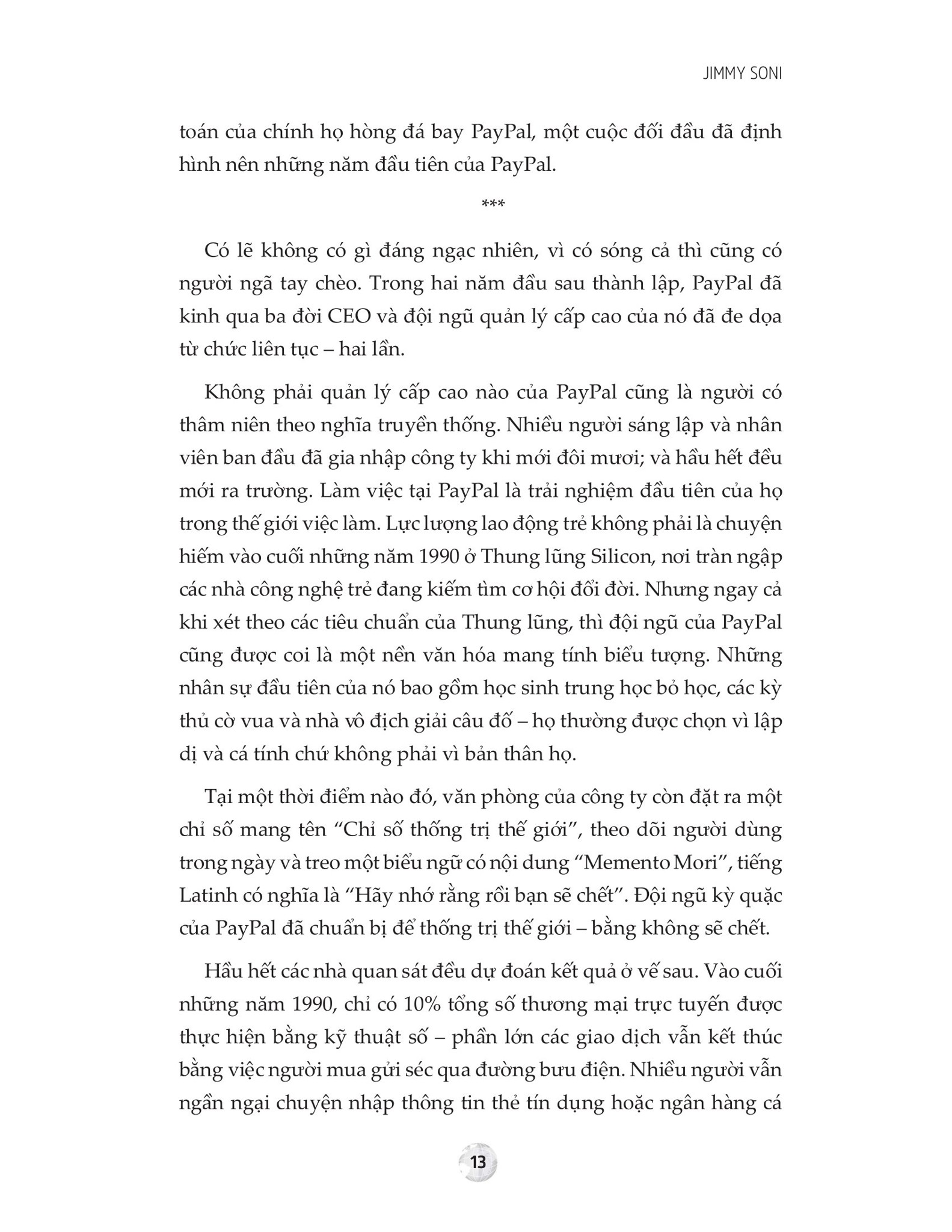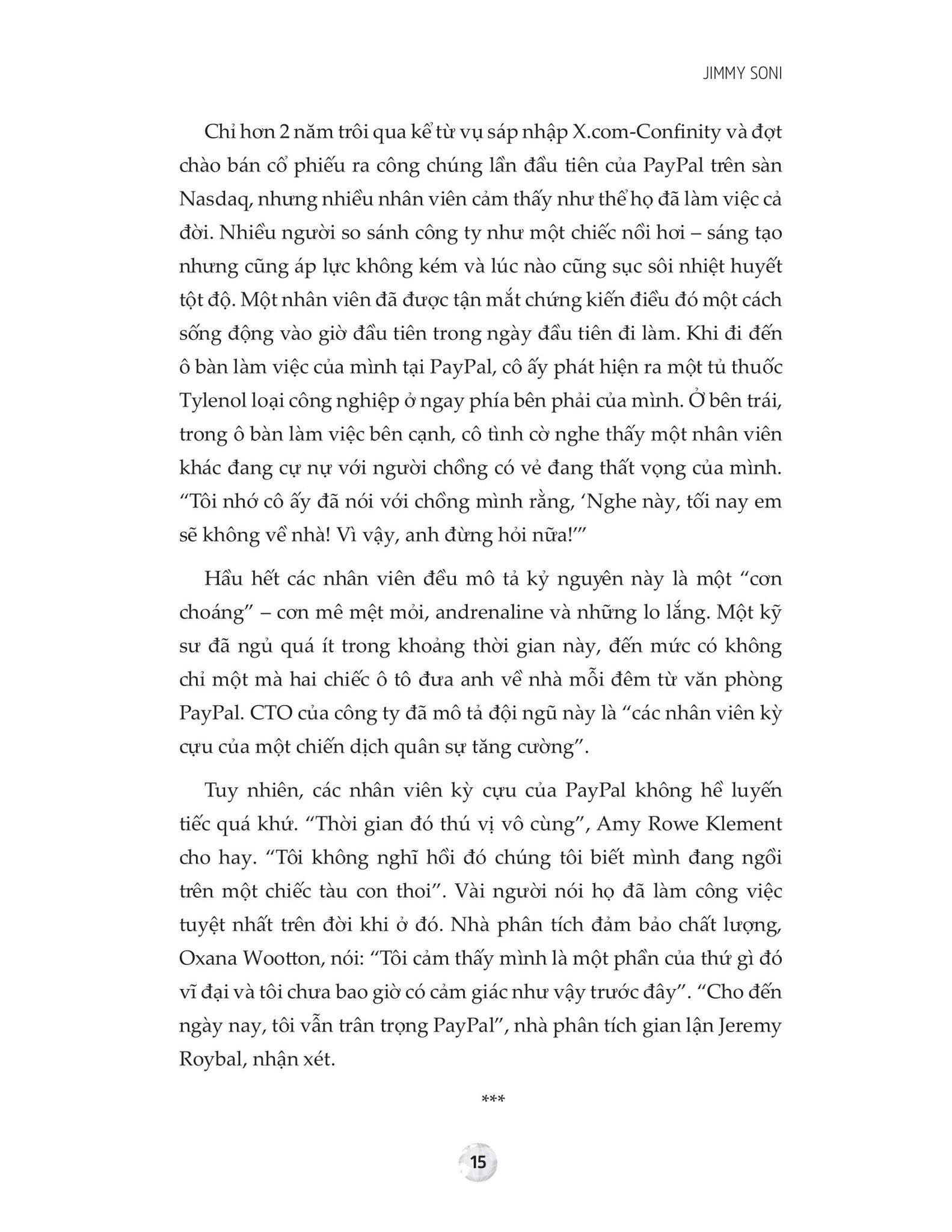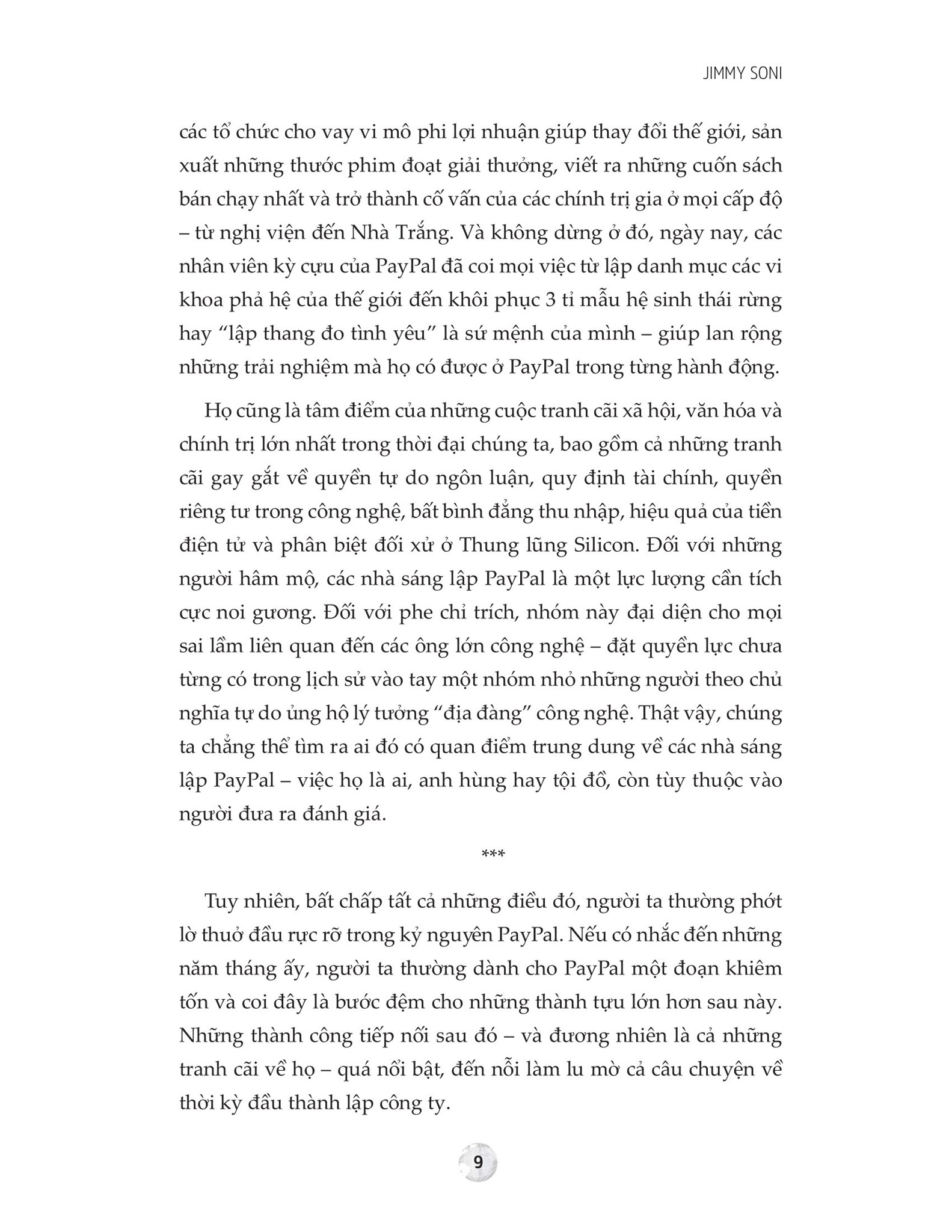 Elon Musk Và Cuộc Cách Mạng Tài Chính Toàn Cầu | | Ngày nay, Elon Musk, Peter Thiel, Max Levchin… được coi là những nhà tiên phong của ngành công nghệ. Tuy nhiên, câu chuyện về nơi họ bắt đầu hầu như không được kể đến. Trước khi thành lập, tài trợ và tư vấn cho các công ty hàng đầu thế giới, bao gồm Tesla, Facebook, YouTube, SpaceX, và LinkedIn, họ là những nhà sáng tạo vô danh của một công ty khởi nghiệp thanh toán trực tuyến nhỏ bé có tên là PayPal. | | Cuốn sách này sẽ khám phá những ngày đầu đầy sóng gió ấy, tìm hiểu câu chuyện về về một nhóm thanh niên tài năng, nhiệt huyết đã tập hợp cùng nhau trong những ngày đầu của internet như thế nào, và thành tựu của họ đã định hình thế giới ngày nay—các công ty khởi nghiệp kỹ thuật số, tài chính không dùng tiền mặt, chuyển tiền điện tử và thay đổi thế giới của chúng ta mãi mãi ra sao. | | Bạn đọc sẽ được chứng kiến hành trình về câu chuyện của công ty PayPal, từ những lần thất bại cho đến sự thành công như ngày nay. Đây là cuốn sách về một ví dụ của thành công, nhưng không tạo gánh nặng cho người đọc bằng những “bài học”. Có một thông điệp quan trọng vượt ngoài cả những bài học về tiền bạc, kinh doanh và cạnh tranh trên thương trường trong cuốn sách. Đó là: Cuộc sống của chúng ta sẽ được định hình bởi những thứ ta tạo ra và những người đồng hành sáng tạo cùng ta. Câu chuyện của PayPal không chỉ là về việc mọi người kết hợp với nhau để tạo nên một sản phẩm – mà còn về cách nhóm cùng nhau định hình chính con người của họ. Những người sáng lập và nhân viên đầu tiên của công ty đã thúc đẩy và yêu cầu nhau phát triển hơn mỗi ngày; để viết nên một dạng câu chuyện cổ tích trong Thung lũng Silicon – Thung lũng điện tử. | | Về tác giả: | | Jimmy Soni là một tác giả từng đoạt nhiều giải thưởng. Cuốn sách Elon Musk và cuộc cách mạng tài chính toàn cầu là cuốn sách bán chạy nhất toàn nước Mỹ và nhận được nhiều lời khen ngợi từ The New York Times, Wall Street Journal, New Yorker, The Economist, Financial Times,… | | Xem thêm