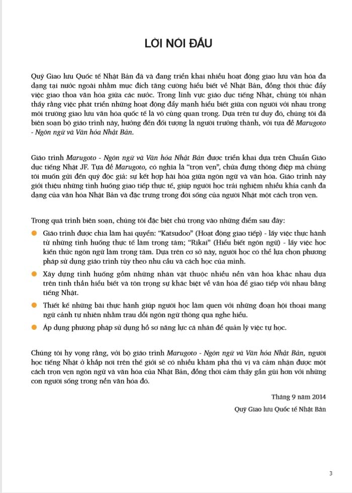 Chúng tôi hy vọng rằng, với bộ giáo trình Marugoto - Ngôn ngữ và Văn hóa Nhật Bản, người học tiếng Nhật ở khắp nơi trên thế giới sẽ có nhiều khám phá thú vị và cảm nhận được một cách trọn vẹn ngôn ngữ và văn hóa của Nhật Bản, đồng thời cảm thấy gần gũi hơn với những con người sống trong nền văn hóa đó.
