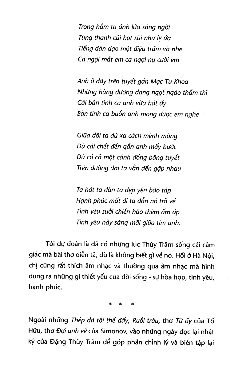 Một cuốn nhật kí nhặt được bên xác của một nữ Việt Cộng đã suýt bị người lính Mỹ ném vào lửa, nhưng người phiên dịch đã khuyên anh ta nên giữ lại vì "trong đó có lửa". Nhật kí Đặng Thùy Trâm là những ghi chép hàng ngày của một người nữ bác sĩ về cuộc sống của chị nơi chiến tuyến. Cuốn nhật kí là thế giới riêng của người trí thức nhạy cảm mà không yếu đuối, tha thiết với cuộc sống mà không hề sợ hãi trước những gian nan. Ở đó ta vẫn gặp những băn khoăn trăn trở trước tình yêu, trước cuộc sống phức tạp hàng ngày, những nỗi buồn, nỗi nhớ nhung, sự cô đơn của một người con gái, nhưng đồng thời chúng ta cũng thấy được một ý chí mãnh liệt, những lời nói tự động viên cảnh tỉnh, một lòng can đảm phi thường - những điều đã làm nên một thế hệ anh hùng. | | Nhận định | | "Chị đứng bên kia chiến tuyến với tôi nhưng những lời của chị làm trái tim tôi đau đớn. Chị là Anne Frank của Việt Nam. Tôi biết cuốn nhật kí này sẽ đi đến khắp nơi trên thế giới" - Frederic Whitehurst | | "Tôi biết Thùy không hề định viết cho cả thế giới này đọc, nhưng có lẽ chính vì thế mà niềm tin sâu thẳm nơi chị được viết ra một cách chân phương, mộc mạc... Cho đến lúc này, tôi là người đã đọc lại hai cuốn Nhật kí ấy nhiều hơn ai hết… Những lời bày tỏ về tình yêu của chị cũng như những lời gọi tha thiết hướng về gia đình khiến bất cứ ai đọc cũng phải xúc động… Lời Thùy là một cây cầu bắc qua dòng sông chứa chất bao sự vô tình, bao cay đắng, bao nỗi buồn, bao lòng tin lầm lạc, đã chia cắt hai dân tộc chúng ta quá lâu…" - Robert Whitehurst | | Nhật kí Đặng Thùy Trâm không phải là một cuốn sách giáo dục đạo đức viết ra để cho hàng ngàn người đọc, mà là một cuốn nhật kí để một người phụ nữ đang sống trong bom đạn dành lại cho mình một chút thời gian giữa bộn bề công việc. Cuốn sổ như một người bạn chân thành, lặng im để chị chia sẻ và lưu giữ lại cuộc sống tinh thần của tuổi thanh xuân. Chính vì vậy, đó là những lời nói chân thành nhất, những lời tâm sự giản dị, những sự chiêm nghiệm và tự động viên không hề mang chút áp đặt. Cuốn sách sẽ làm cho bạn đọc trào nước mắt với những trăn trở và đớn đau của chị, phải nghiêng mình ngưỡng mộ ý chí và tấm lòng dành cho nhiệm vụ, phải buồn bã cùng với những tâm sự rất bình thường của một người thanh niên xa gia đình, tình yêu không phẳng lặng. Chẳng hề có kỹ thuật viết, những dòng ghi chép như được rút ra từ trái tim và tâm hồn của một người con gái chân thành và mộc mạc. Đó quả thực là một cuốn sách để chúng ta đọc, xúc động, cảm thông và thấu hiểu. - Nhã Nam | | "So với lớp thanh niên ngày nay, người thanh niên của gần bốn chục năm trước có một cách sống khác, một cách sống không lắm chiều cạnh phong phú, không tự do nhiều vẻ, nhưng lại trong sáng thánh thiện đến kỳ lạ. Sự tận tụy làm người của Thùy Trâm là nhân tố khiến cho những người lính Mỹ khác hẳn về lý tưởng cũng phải kính trọng… Trong sự muôn màu muôn vẻ của thực tại, con người vẫn là mẫu số chung làm nên những giá trị vĩnh cửu. Nhật kí Đặng Thùy Trâm có cái nhân tố nhân văn đầy bí mật đó." - Vương Trí Nhàn | | “Một nhật kí thời chiến bị thất lạc mà trong đó tác giả nói về tình yêu, sự cô đơn và cái chết trên đường mòn Hồ Chí Minh đã trở thành một cuốn sách bán chạy nhất tại Việt Nam, mang tới một cái nhìn mới mẻ về chiến tranh cho thế hệ bạn đọc mới.” - The New York Times | | Xem thêm