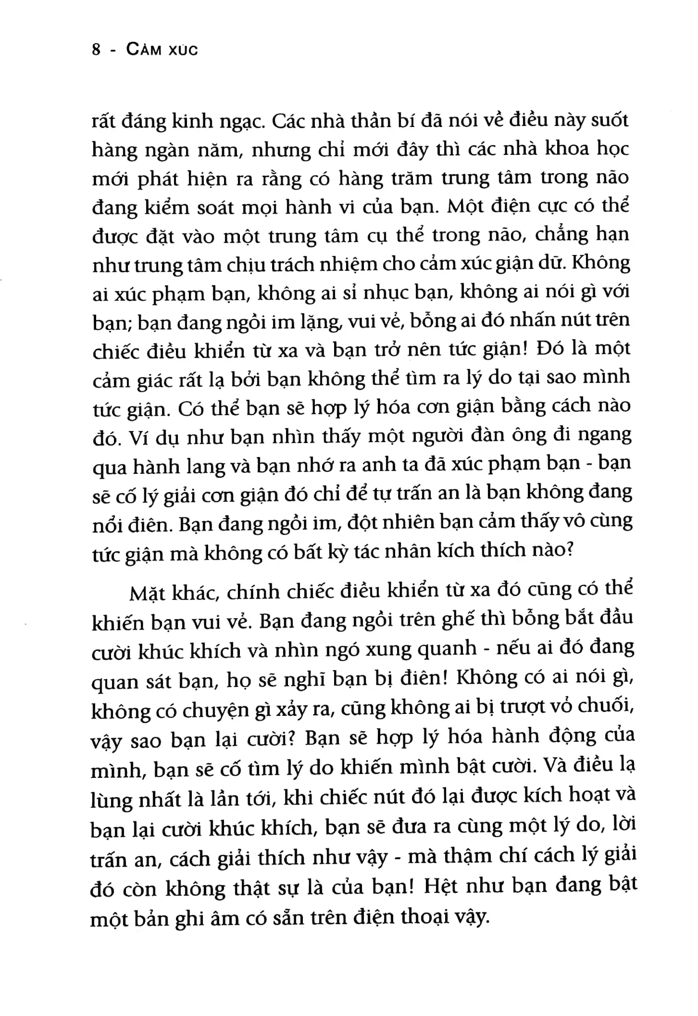 “Cảm xúc” là một cuốn sách thú vị dành cho những tâm trí cởi mở, những người có ý thức cao về giá trị cốt lõi của bản thân và tìm kiếm sự khai sáng. Đây hẳn không phải là một cuốn sách dễ đọc, bởi sự thẳng thắn của Osho có thể làm phiền lòng một số độc giả. Nhưng điều đó hoàn toàn không làm giảm đi giá trị của những bài giảng ông đem lại, mà đó mới chính là thứ góp phần tạo nên phong cách độc đáo của Osho - một bậc thầy tâm linh vĩ đại.