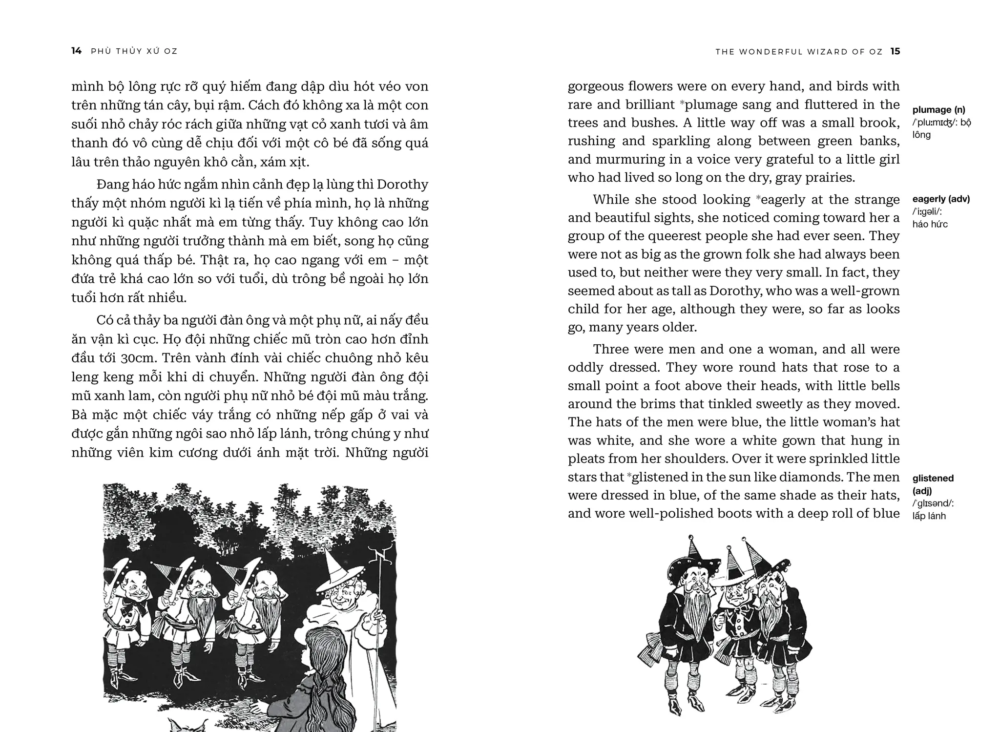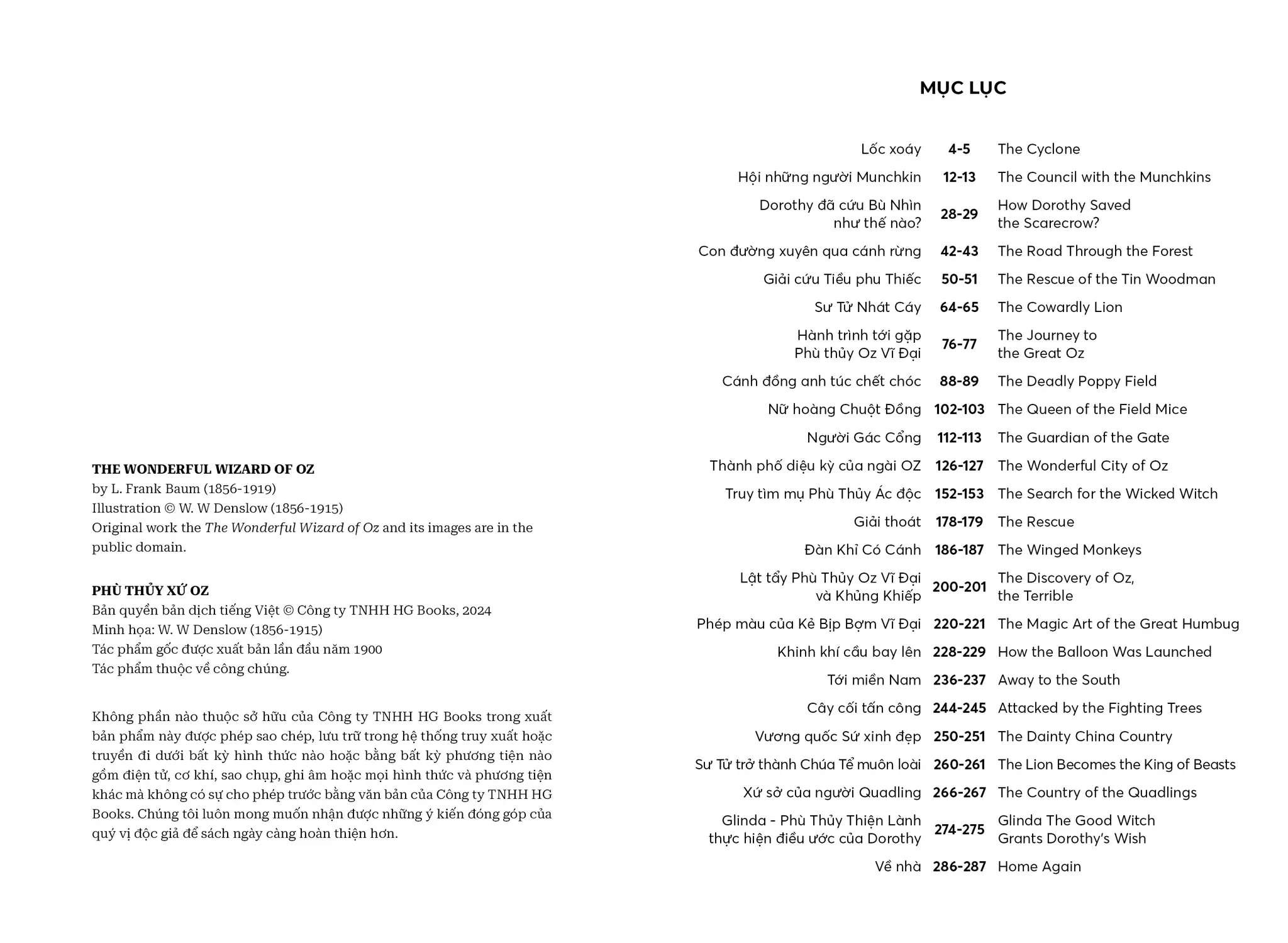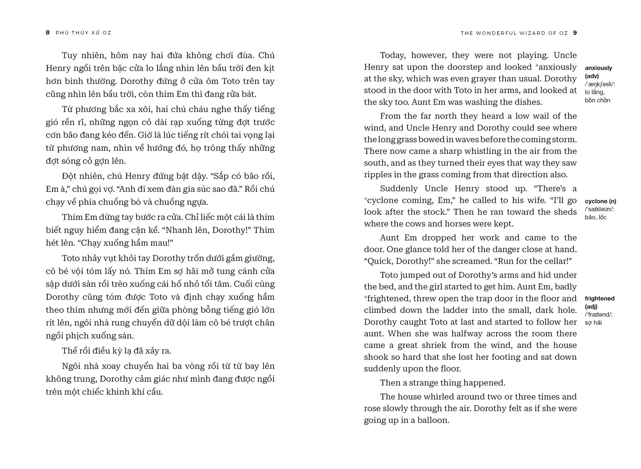 The Wonderful Wizard of Oz - Phù Thuỷ Xứ Oz - Song Ngữ Việt-Anh | | NỘI DUNG | | “Phù Thuỷ Xứ Oz” (The Wonderful Wizard of Oz) của L. Frank Baum là tác phẩm văn học kinh điển đưa người đọc vào thế giới huyền diệu của xứ Oz, nơi cô bé Dorothy và những người bạn của mình trải qua một cuộc phiêu lưu kỳ thú, đầy ắp yếu tố kỳ diệu và những bài học ý nghĩa về lòng dũng cảm, trí tuệ, và tình bạn chân thành. | | Cuốn sách không chỉ là câu chuyện phiêu lưu hấp dẫn dành cho trẻ em mà còn chứa đựng những triết lý nhân văn sâu sắc về sự tự tin, sức mạnh của lòng trung thành và TÌNH BẠN CAO QUÝ. Câu chuyện khuyến khích độc giả trẻ tuổi mơ ước và tin tưởng vào khả năng của chính mình. | | THÀNH TÍCH CỦA CUỐN SÁCH | | • “Phù Thuỷ Xứ Oz” đã chinh phục độc giả trên khắp thế giới và được dịch ra hơn 50 ngôn ngữ và trên 100 triệu bản được tiêu thụ toàn cầu, cuốn sách đã khẳng định vị trí không thể thay thế trong lòng độc giả suốt hơn một thế kỷ qua. | | • Tác phẩm đã được tái hiện qua nhiều phiên bản điện ảnh, hoạt hình và sân khấu, mang đến làn gió mới mẻ, thổi bùng sức sống khiến tác phẩm sống mãi với thời gian. ĐIỂM KHÁC BIỆT CỦA PHIÊN BẢN SONG NGỮ VIỆT-ANH SO VỚI CÁC PHIÊN BẢN KHÁC CÓ TRÊN THỊ TRƯỜNG | | • Phần tiếng Anh là tác phẩm gốc của L. Frank Baum được xuất bản lần đầu năm 1900. | | • Đây cũng là phiên bản Phù Thuỷ Xứ Oz song ngữ Anh-Việt duy nhất trên thị trường giúp mọi độc giả luyện thêm tiếng Anh, giải trí, tăng vốn từ qua tác phẩm đậm chất nhân văn. | | • Trình bày song song hai ngôn ngữ giúp học tiếng Anh (hoặc người nước ngoài học tiếng Việt) một cách dễ dàng cùng phần ghi chú từ vựng và phiên âm vô cùng sáng tạo, độc đáo. | | • Sách song ngữ còn được tặng kèm link download phiên bản audio cho các độc giả muốn nghe truyện bằng tiếng Anh. | | Xem thêm
