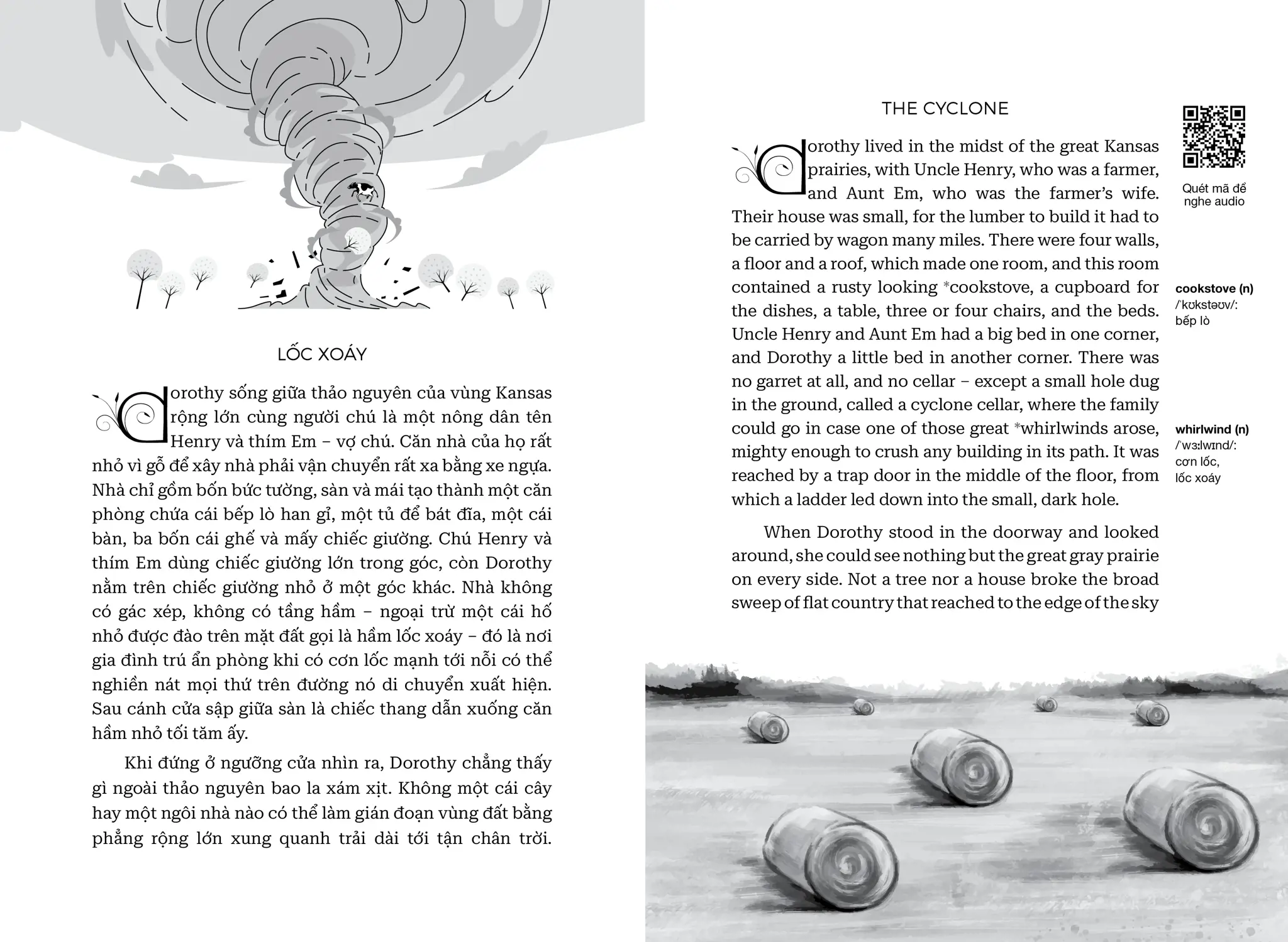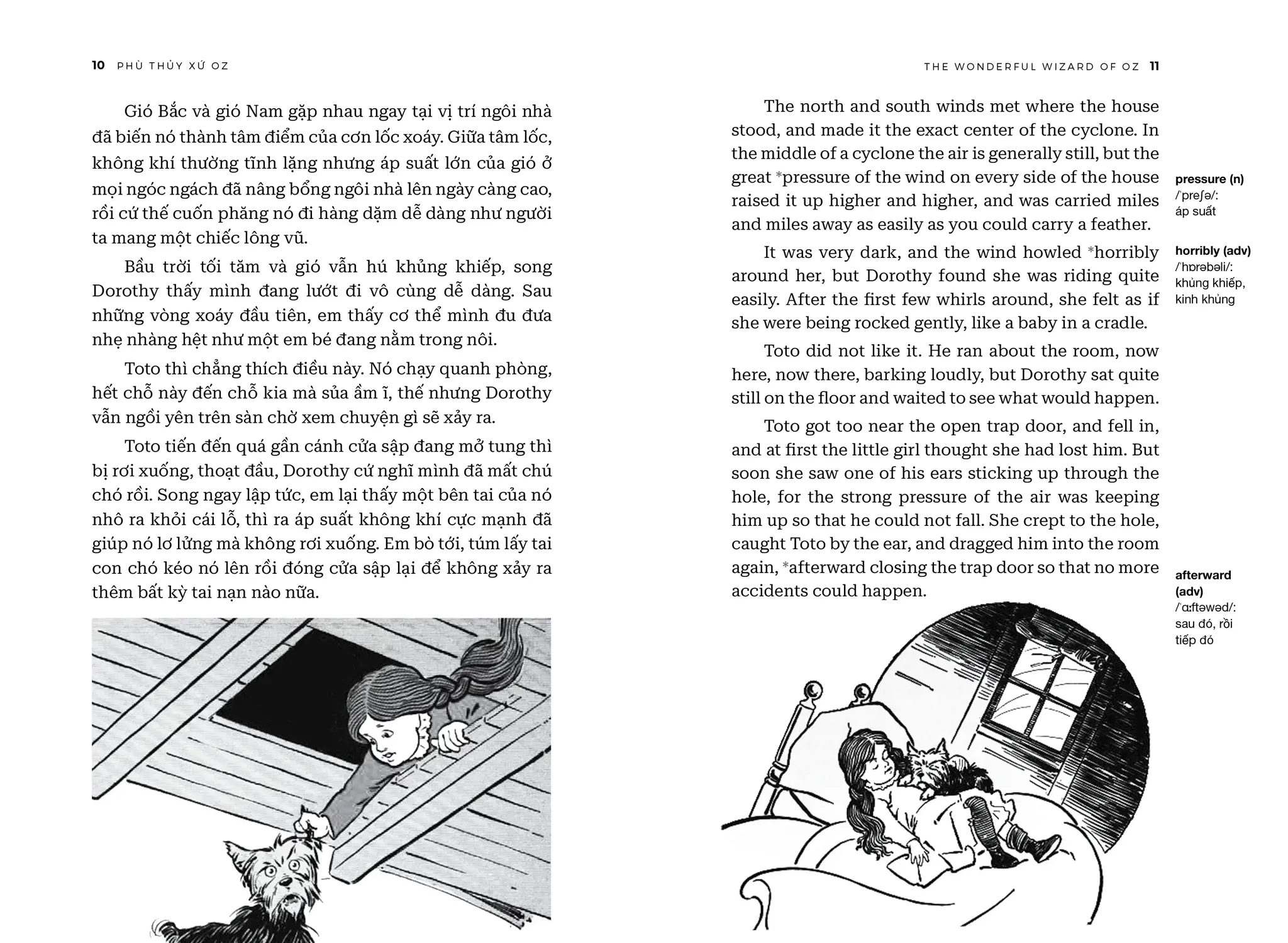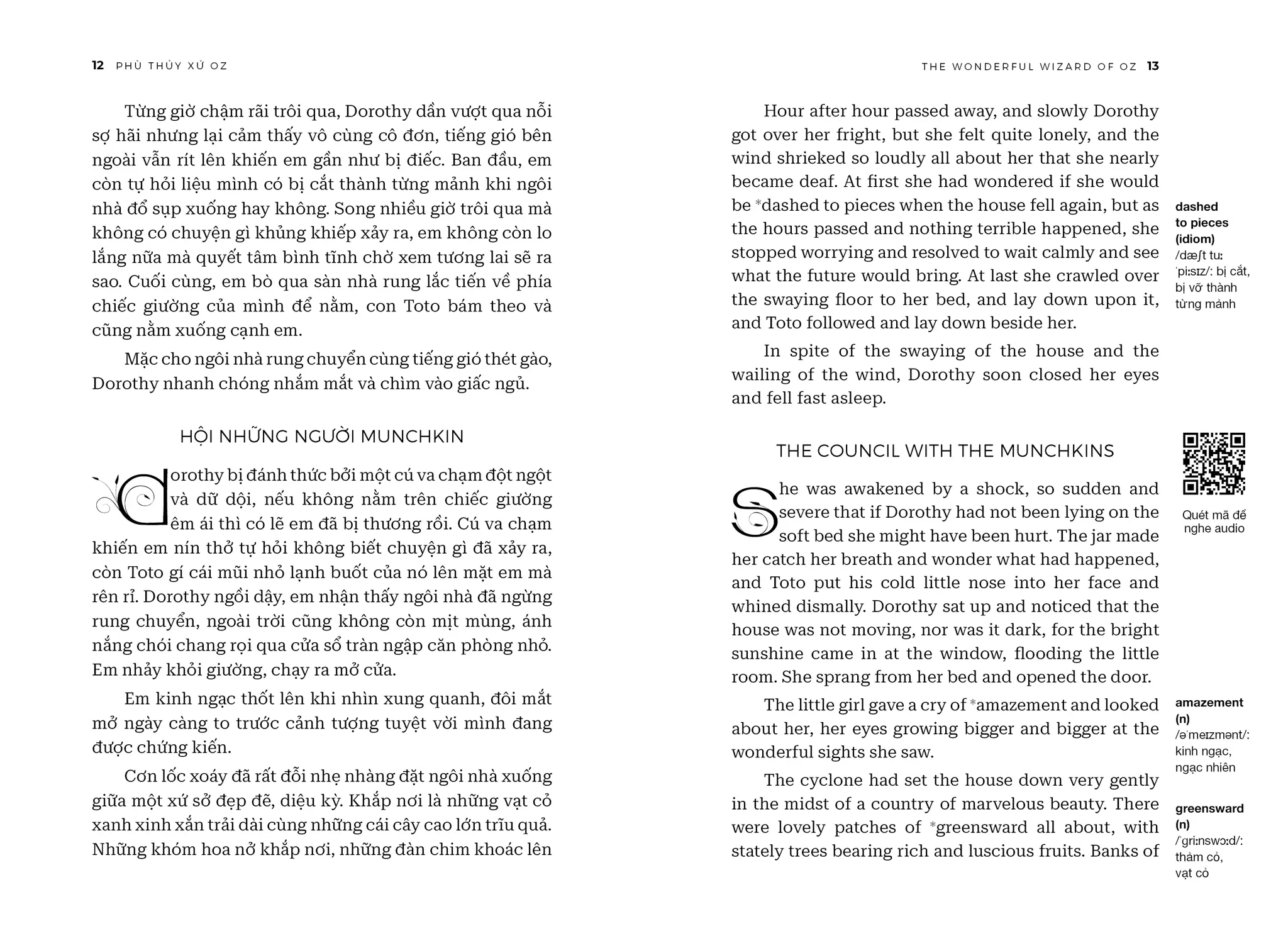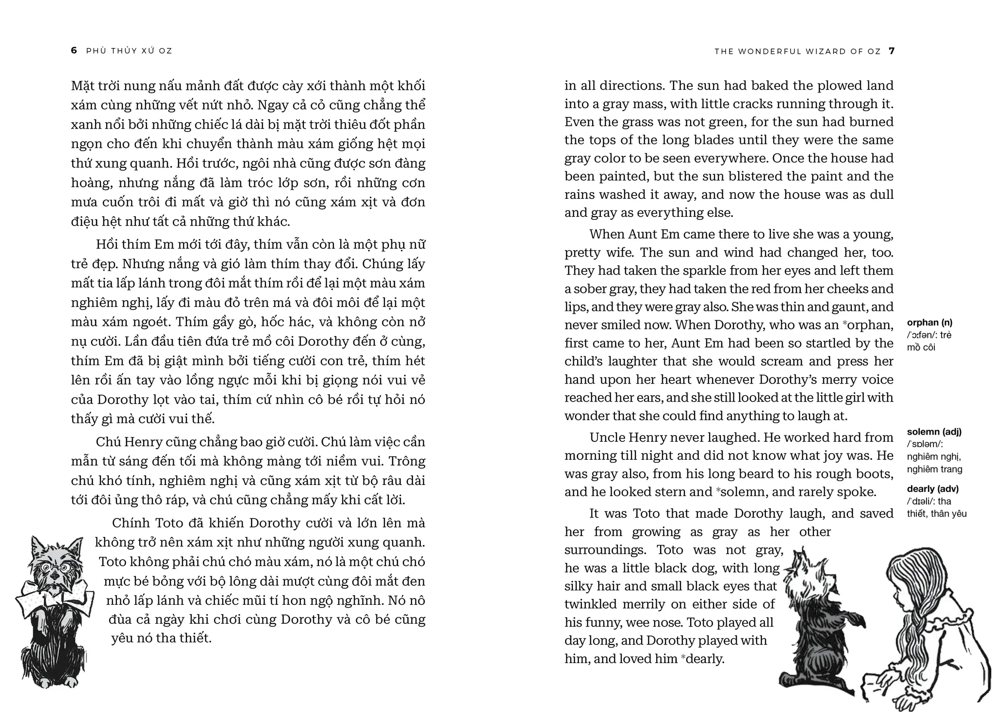 The Wonderful Wizard of Oz - Phù Thuỷ Xứ Oz - Song Ngữ Việt-Anh | | NỘI DUNG | | “Phù Thuỷ Xứ Oz” (The Wonderful Wizard of Oz) của L. Frank Baum là tác phẩm văn học kinh điển đưa người đọc vào thế giới huyền diệu của xứ Oz, nơi cô bé Dorothy và những người bạn của mình trải qua một cuộc phiêu lưu kỳ thú, đầy ắp yếu tố kỳ diệu và những bài học ý nghĩa về lòng dũng cảm, trí tuệ, và tình bạn chân thành. | | Cuốn sách không chỉ là câu chuyện phiêu lưu hấp dẫn dành cho trẻ em mà còn chứa đựng những triết lý nhân văn sâu sắc về sự tự tin, sức mạnh của lòng trung thành và TÌNH BẠN CAO QUÝ. Câu chuyện khuyến khích độc giả trẻ tuổi mơ ước và tin tưởng vào khả năng của chính mình. | | THÀNH TÍCH CỦA CUỐN SÁCH | | • “Phù Thuỷ Xứ Oz” đã chinh phục độc giả trên khắp thế giới và được dịch ra hơn 50 ngôn ngữ và trên 100 triệu bản được tiêu thụ toàn cầu, cuốn sách đã khẳng định vị trí không thể thay thế trong lòng độc giả suốt hơn một thế kỷ qua. | | • Tác phẩm đã được tái hiện qua nhiều phiên bản điện ảnh, hoạt hình và sân khấu, mang đến làn gió mới mẻ, thổi bùng sức sống khiến tác phẩm sống mãi với thời gian. ĐIỂM KHÁC BIỆT CỦA PHIÊN BẢN SONG NGỮ VIỆT-ANH SO VỚI CÁC PHIÊN BẢN KHÁC CÓ TRÊN THỊ TRƯỜNG | | • Phần tiếng Anh là tác phẩm gốc của L. Frank Baum được xuất bản lần đầu năm 1900. | | • Đây cũng là phiên bản Phù Thuỷ Xứ Oz song ngữ Anh-Việt duy nhất trên thị trường giúp mọi độc giả luyện thêm tiếng Anh, giải trí, tăng vốn từ qua tác phẩm đậm chất nhân văn. | | • Trình bày song song hai ngôn ngữ giúp học tiếng Anh (hoặc người nước ngoài học tiếng Việt) một cách dễ dàng cùng phần ghi chú từ vựng và phiên âm vô cùng sáng tạo, độc đáo. | | • Sách song ngữ còn được tặng kèm link download phiên bản audio cho các độc giả muốn nghe truyện bằng tiếng Anh. | | Xem thêm